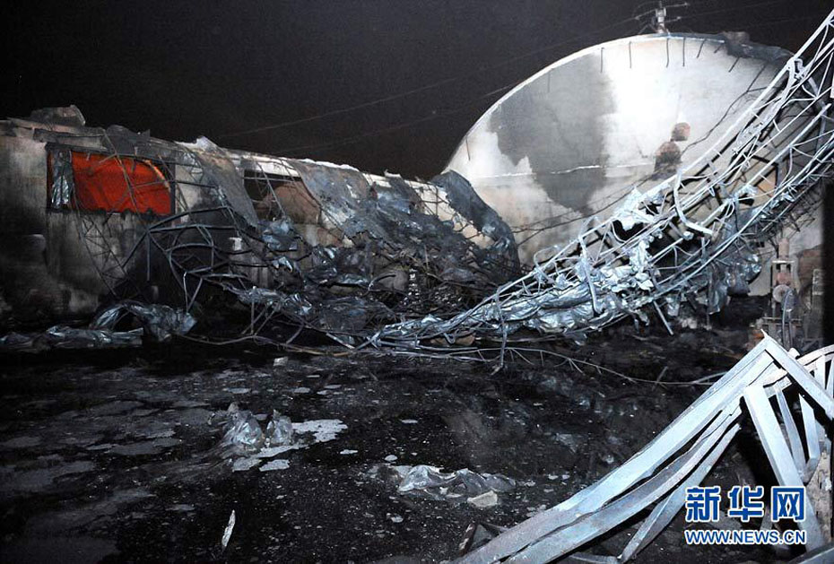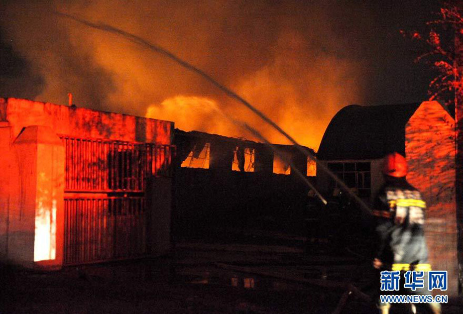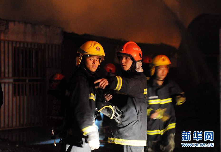 9月25日,消防官兵在火災現(xiàn)場進行撲救。當日晚間,烏魯木齊國際機場跑道東側圍墻外一家“恒利擠塑板廠”發(fā)生火災并有爆炸,由于有爆炸物散落到機場跑道,烏魯木齊國際機場關閉了一個小時,清理跑道。圖片來源:新華網(wǎng) 王菲 攝