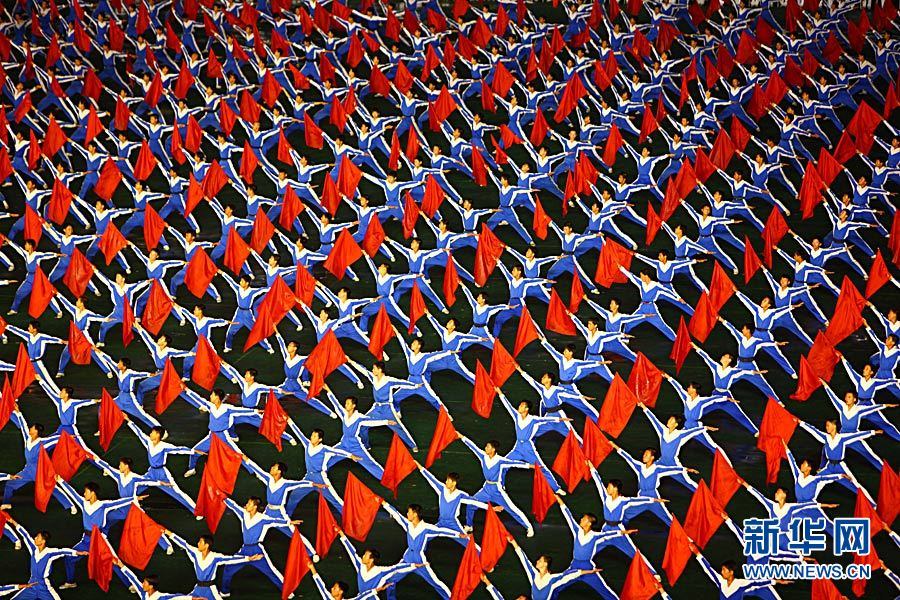 8月14日,朝鮮青少年在平壤“五一體育場”表演大型團體操和文藝表演《阿里郎》!栋⒗锢伞酚沙r10萬名青少年和專業(yè)藝術(shù)工作者參與演出,規(guī)模之大堪稱世界之最。2007年8月,《阿里郎》被載入《吉尼斯世界紀錄》。朝鮮勞動黨代表會議將于9月28日在平壤舉行。劉宇攝 圖片來源:新華網(wǎng)