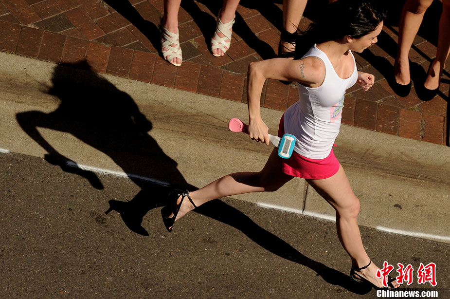 9月28日,澳大利亞悉尼舉行了一場“高跟鞋接力賽”。參賽選手們將穿至少3英寸高跟鞋,進(jìn)行4×100米接力賽跑,這項活動是為了幫助乳癌患者治療募集基金。