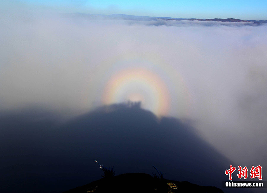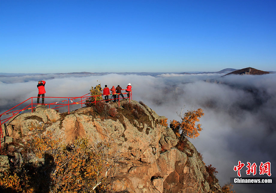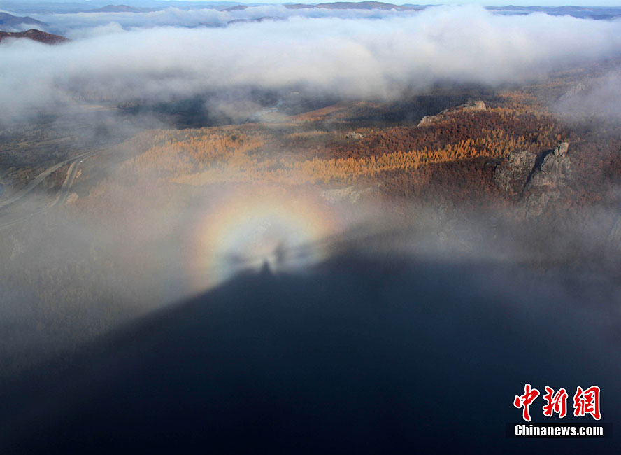10月3日清晨,在地處內(nèi)蒙古呼倫貝爾大興安嶺的牙克石巴林國家森林公園內(nèi),海拔近千米的喇嘛峰四周霧海翻騰,再現(xiàn)“秋日佛光”奇觀,讓賞景的游客嘖嘖稱奇。紀(jì)明國 攝 圖片來源:cnsphoto