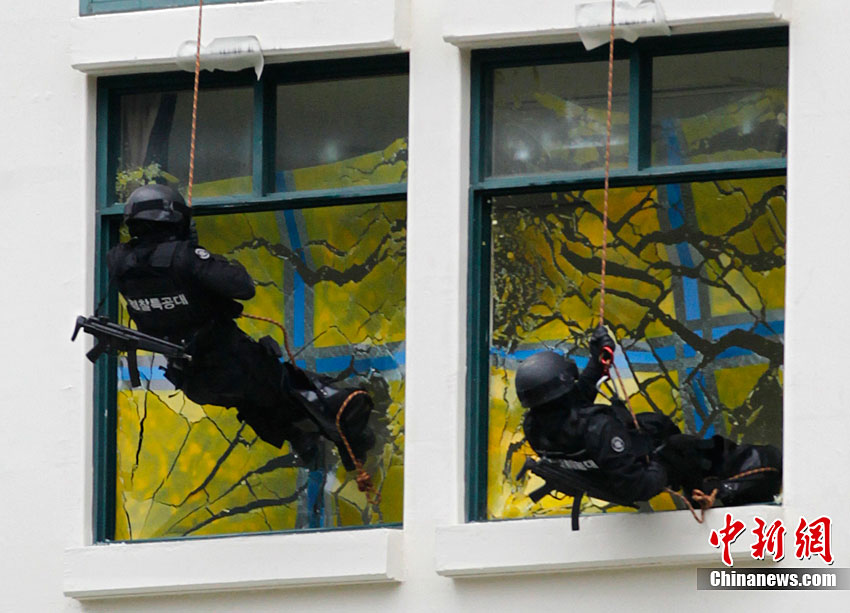 當(dāng)?shù)貢r(shí)間10月4日,韓國特警在首爾舉行了反恐演習(xí)。此次演習(xí)是為了即將于11月在韓國舉行的G20首腦峰會(huì)而做的準(zhǔn)備工作。