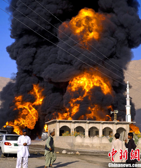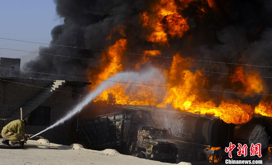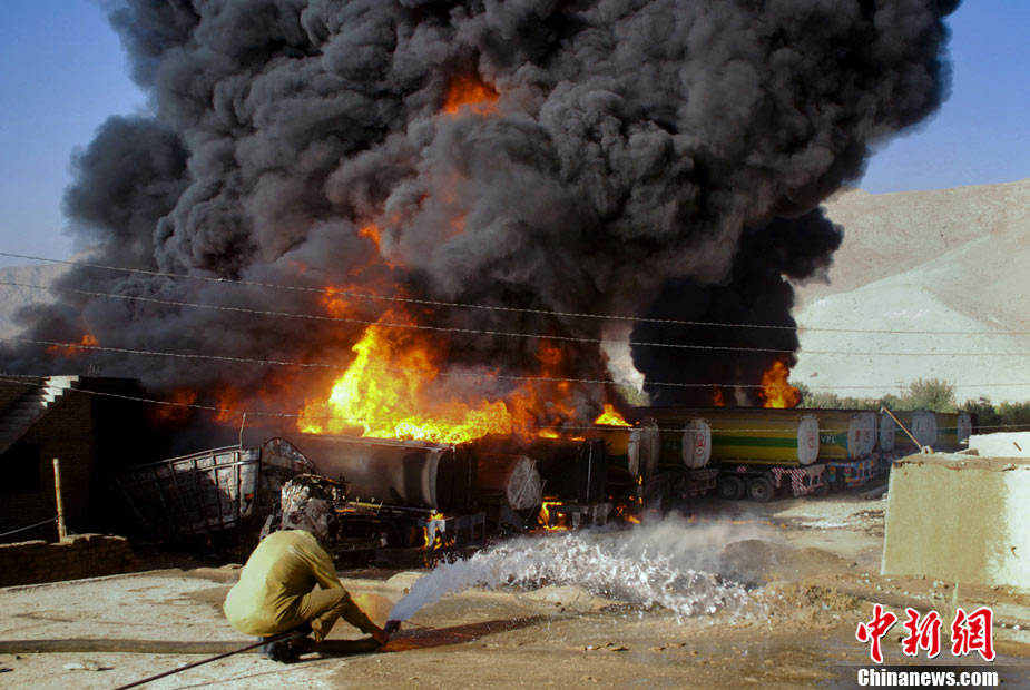 10月6日早晨,20多輛北約油罐車在巴基斯坦西部城市奎達附近被一伙身份不明的武裝分子燒毀,警方稱可能有人員傷亡。據(jù)報道稱,火勢非常猛烈,從距離很遠的地方都能看到。消防隊員正在實施緊急滅火作業(yè)。