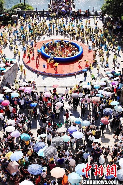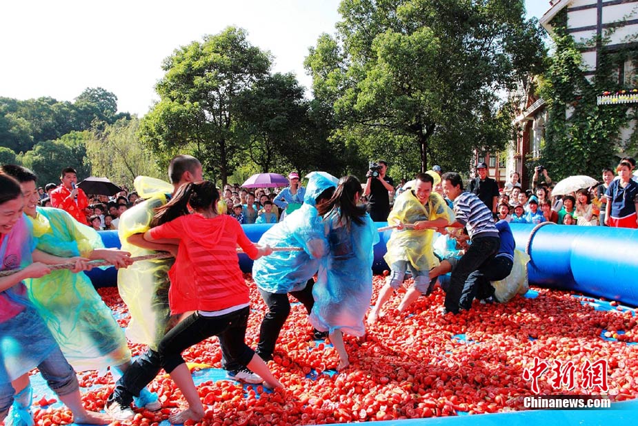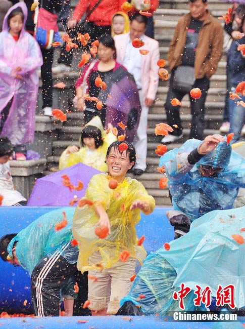 10月6日,艷陽高照的長(zhǎng)沙世界之窗公園里,一群身著雨衣的年輕人在鋪滿西紅柿的池子里玩老鷹抓小雞的游戲,場(chǎng)面滑稽而激烈。國(guó)慶節(jié)期間,每天都有數(shù)千游客來這里參與“西紅柿大戰(zhàn)”,他們或用西紅柿互相“攻擊”,或玩拔河、老鷹抓小雞等游戲,盡情歡樂。中新社記者 肖前輝 攝