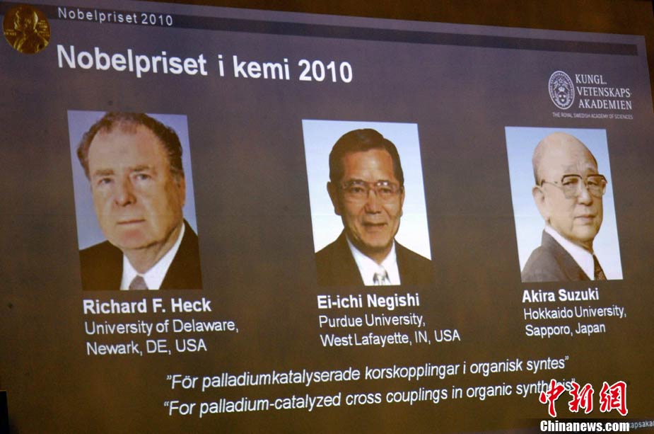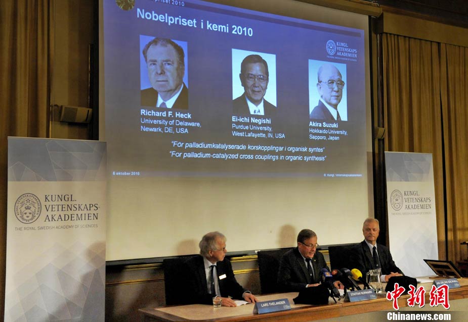當(dāng)?shù)貢r間10月6日,瑞典皇家科學(xué)院宣布將2010年諾貝爾化學(xué)獎授予美國科學(xué)家理查德-赫克、日本科學(xué)家根岸榮一和鈴木章。