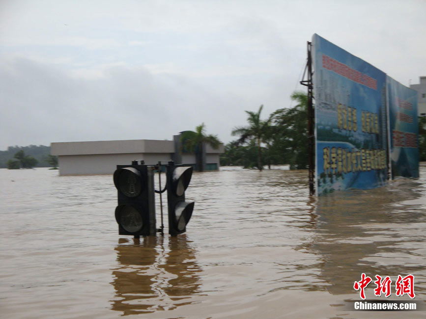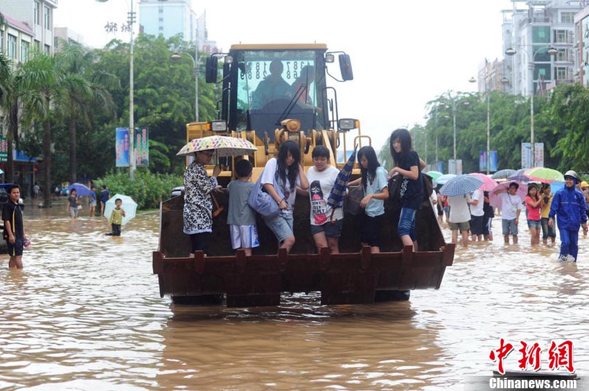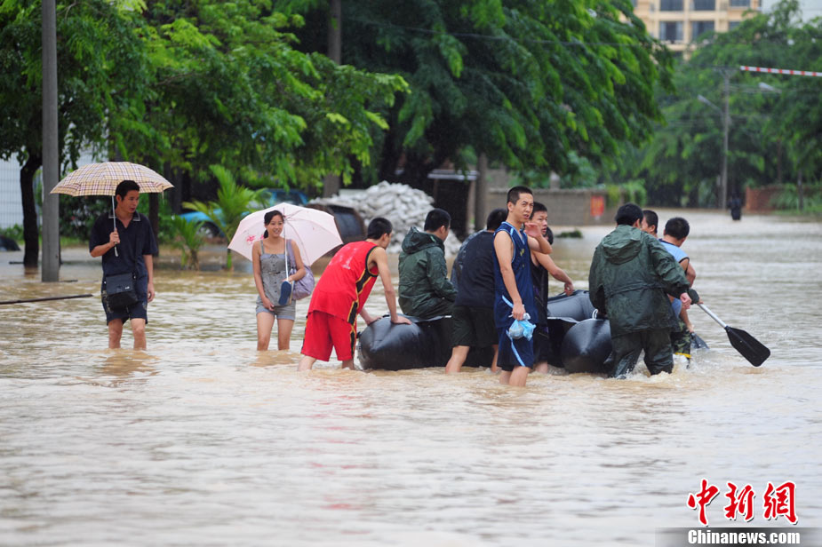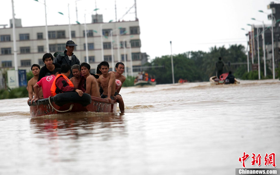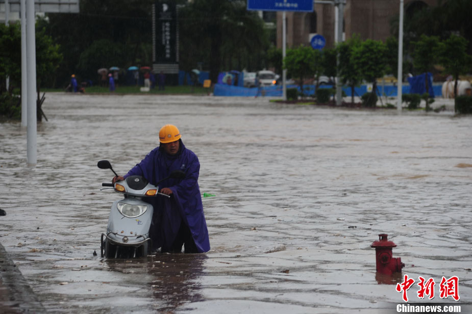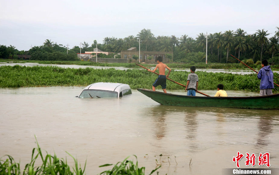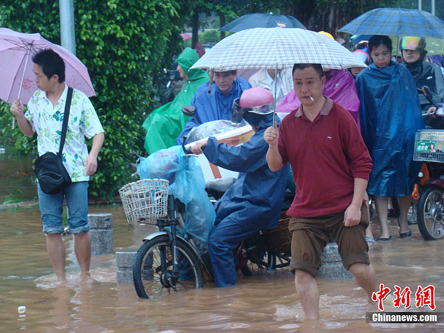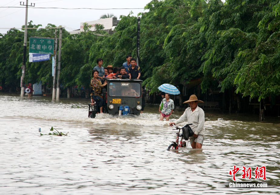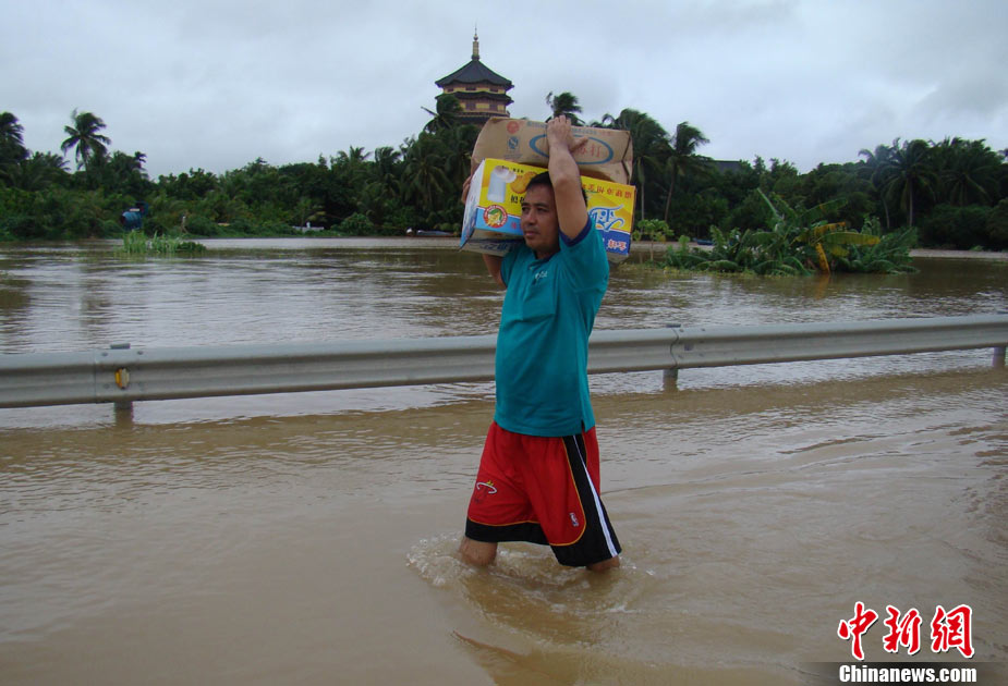 10月9日,海南省萬寧市萬城鎮(zhèn)北坡,暴雨過后的洪水依然沒有完全消退,民眾在洪水中艱難前行。自9月30日夜間至10月7日19時止,萬寧市連續(xù)8天普降大暴雨,局部特大暴雨,降雨量達1121.4毫米,全市20個觀測站累積降雨量均超過1000毫米,最大的為龍滾站1343.6毫米,過程雨量為歷史罕見。中新社記者 尹海明 攝