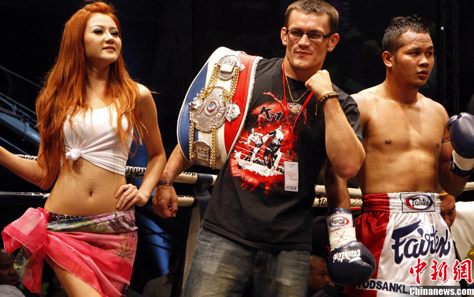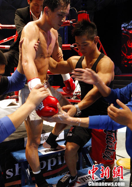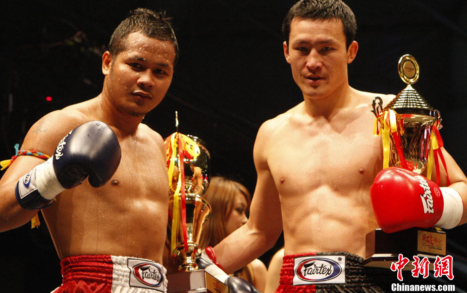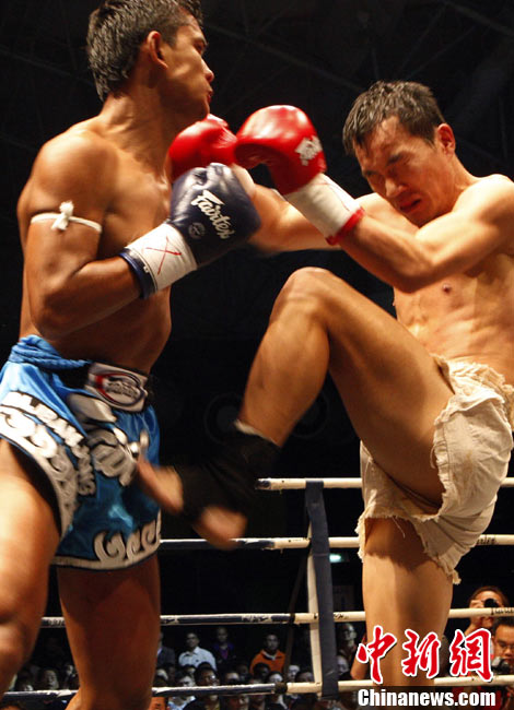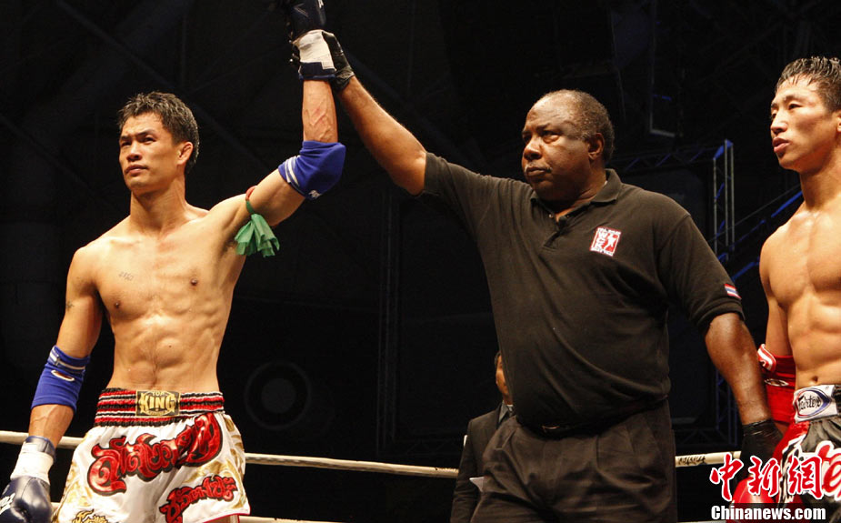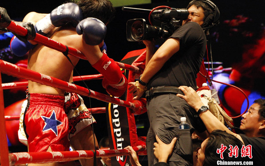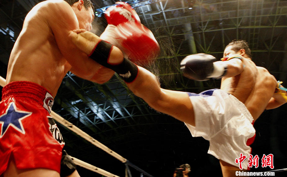 10月9日晚,由馬來西亞IPC國際集團(tuán)和中國國際文化傳播中心以及英雄傳說賽事機(jī)構(gòu)聯(lián)手主辦的“英雄傳說-決戰(zhàn)云頂”世界搏擊王者爭霸賽暨中泰拳王爭霸戰(zhàn)在馬來西亞吉隆坡云頂舉行。圖為泰國拳王雅?巳R與中國王冠對決。 中新社記者 錢興強(qiáng) 攝