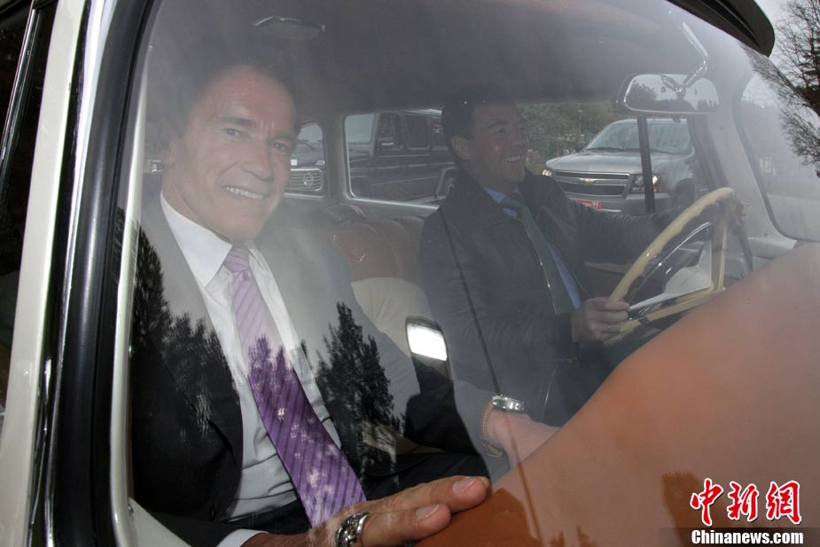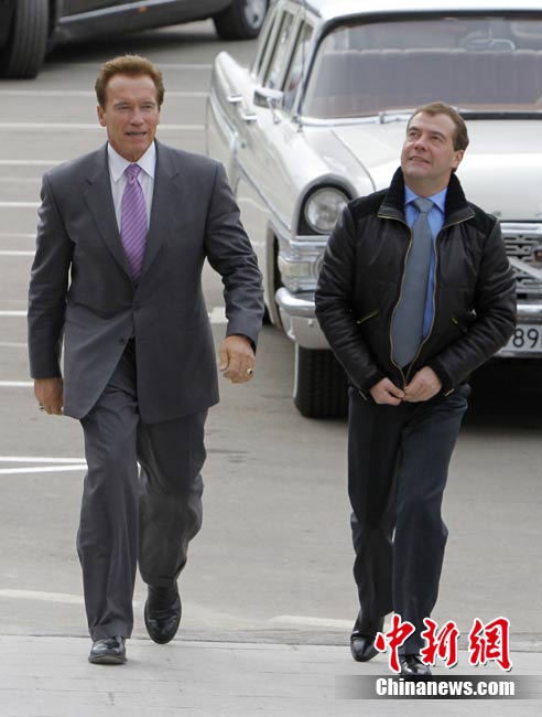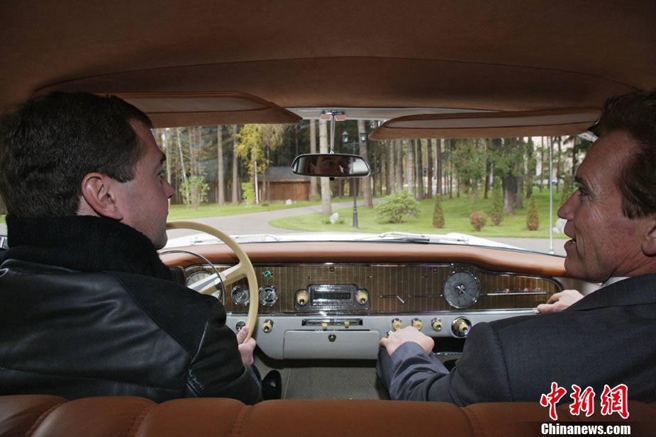 10月11日,莫斯科,美國加州州長施瓦辛格訪問俄羅斯,與俄羅斯總統(tǒng)梅德韋杰夫會(huì)面。梅德韋杰夫總統(tǒng)還為施瓦辛格客串了一把“司機(jī)!
