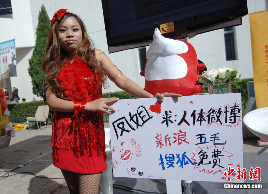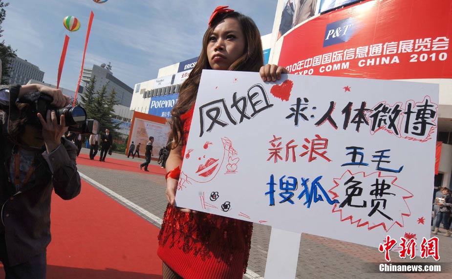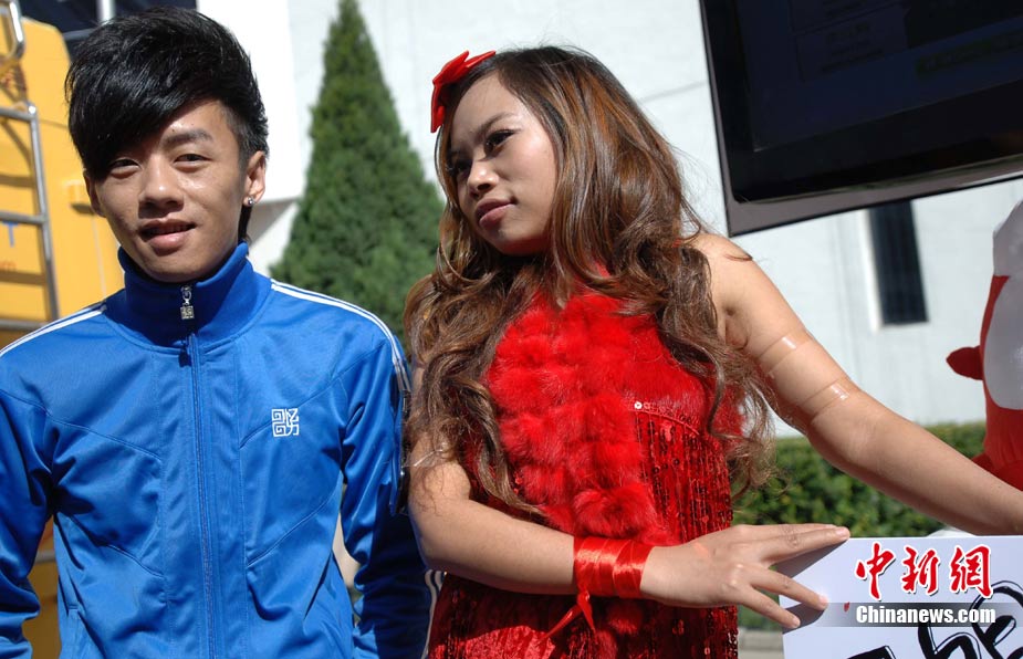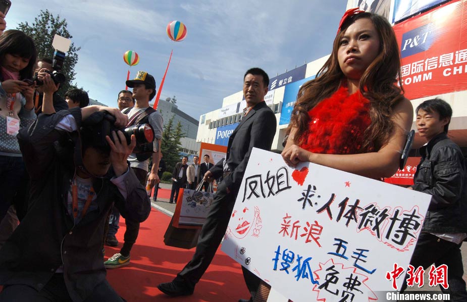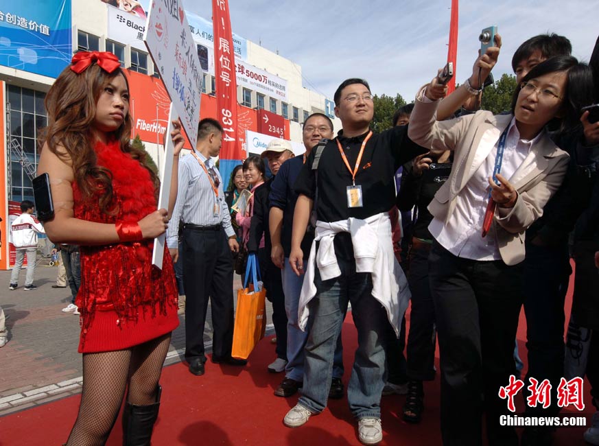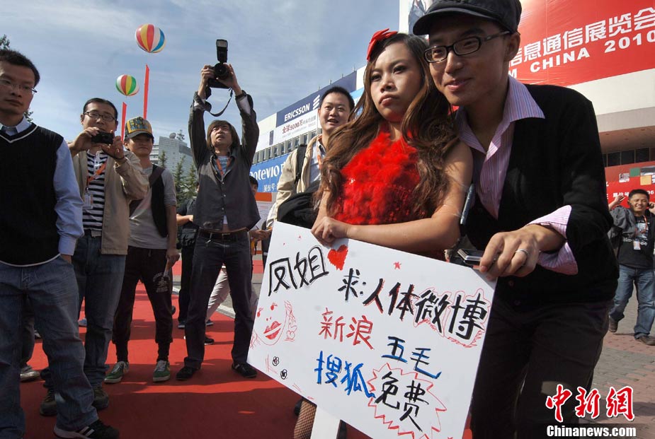 10月12日,中國網(wǎng)絡(luò)紅人--鳳姐在北京中國國際展覽中心亮相,她在參加2010中國國際信息通信展覽會宣傳時(shí),受到數(shù)百網(wǎng)絡(luò)粉絲的熱捧,并拍照留影。圖為一名男子與鳳姐合影。中新社記者 鄒憲 攝