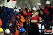 智利首名升井礦工弗洛倫西奧•阿瓦洛斯(Florencio Avalos)北京時間13日上午11點10分左右搭乘特制救生艙回到地面,成功獲救。目前,救援工作成功邁出第一步,救生艙接下來將繼續(xù)放入井下,營救其余32名被困礦工。圖為阿瓦洛斯出井后與智利總統(tǒng)皮涅拉擁抱。
