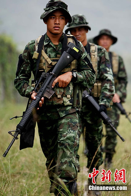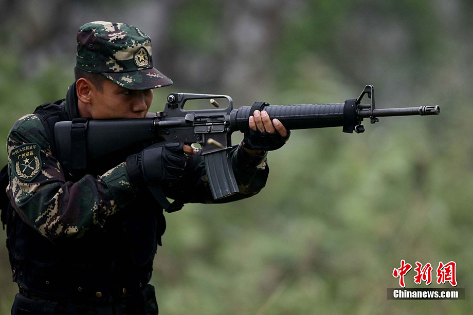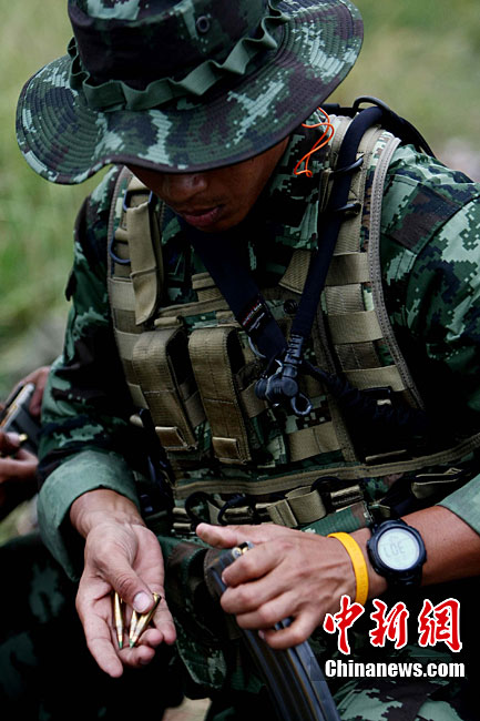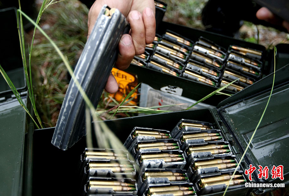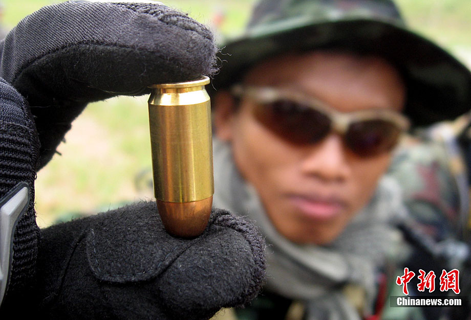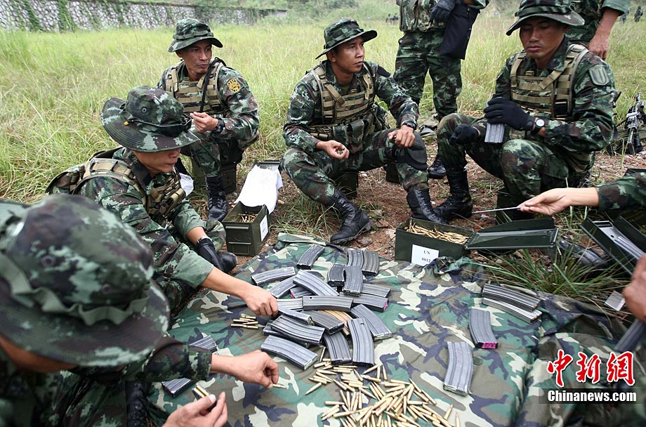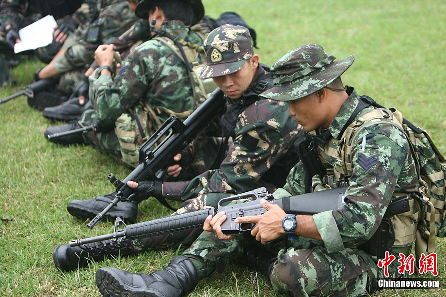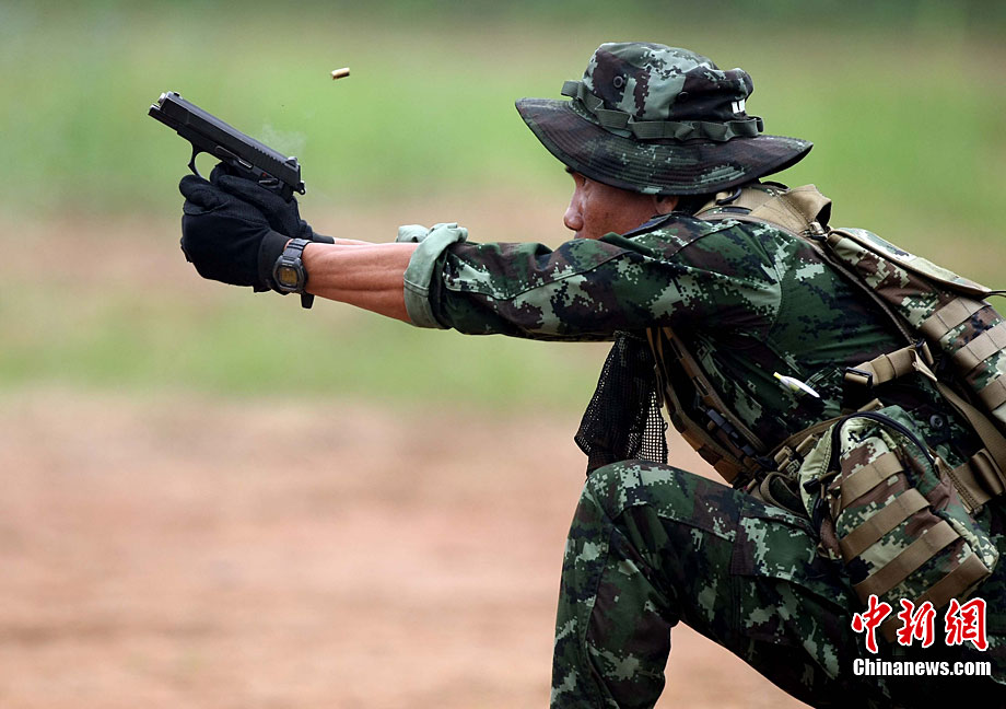 “突擊-2010”中泰陸軍特種部隊反恐聯(lián)合訓(xùn)練10月6日至20日在廣西壯族自治區(qū)桂林進(jìn)行。中泰雙方將各派出60余人的特種分隊參加訓(xùn)練。此次聯(lián)合訓(xùn)練分展示交流、混編同訓(xùn)和綜合演練三個階段,主要圍繞城市反恐基礎(chǔ)技能訓(xùn)練、混編分隊?wèi)?zhàn)術(shù)訓(xùn)練等科目進(jìn)行。圖為泰方隊員M16步槍實彈速射。中新社記者 杜洋 攝