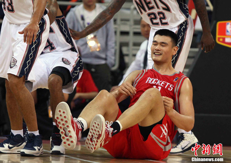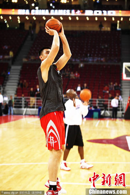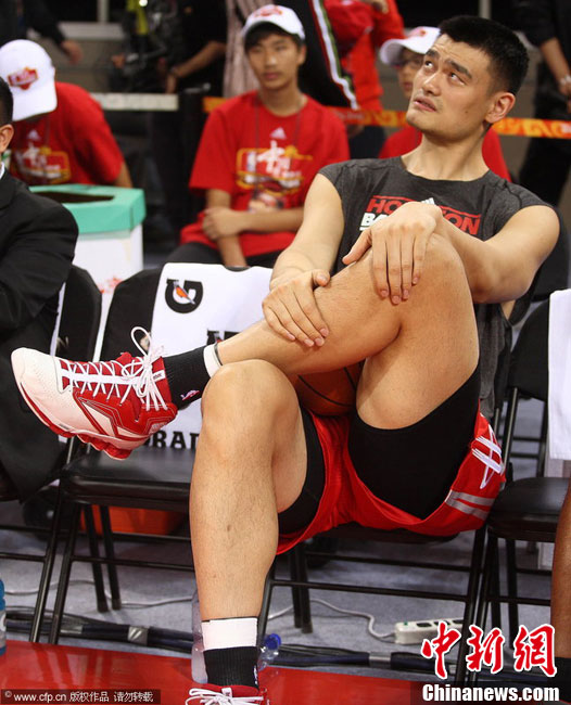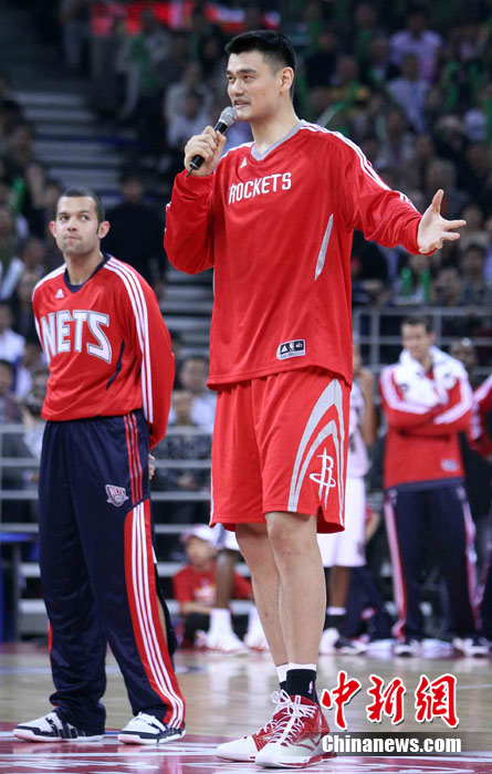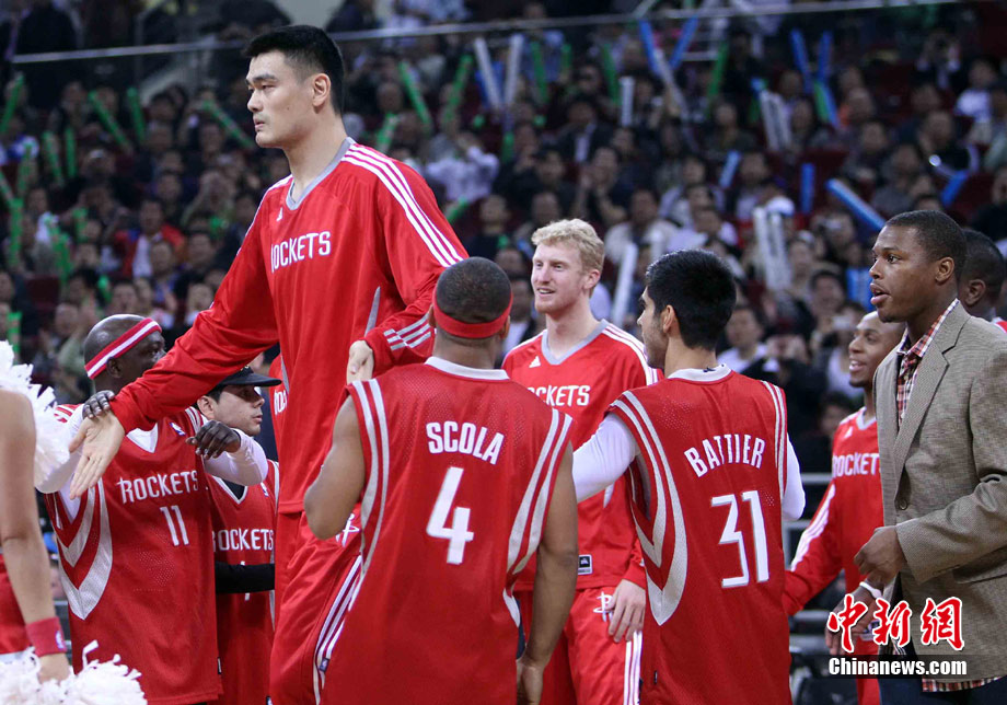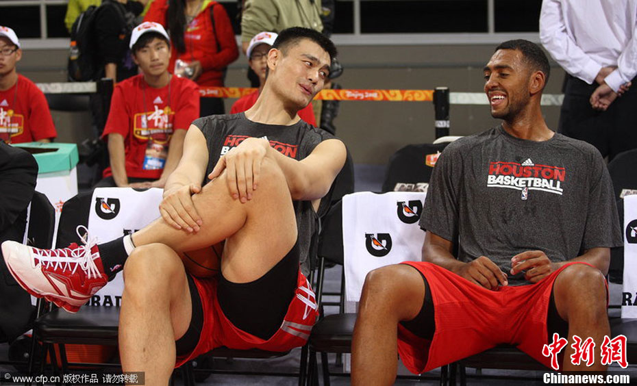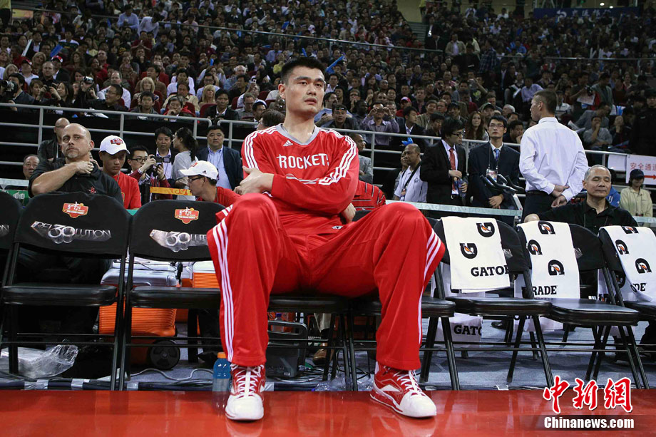 10月13日,NBA中國賽第一場比賽在北京五棵松體育館舉行,休斯敦火箭隊迎戰(zhàn)新澤西網隊。兩支球隊將于本月16日在廣州進行第二場比賽。圖為姚明熱身后在場邊休息。圖片來源:CFP視覺中國