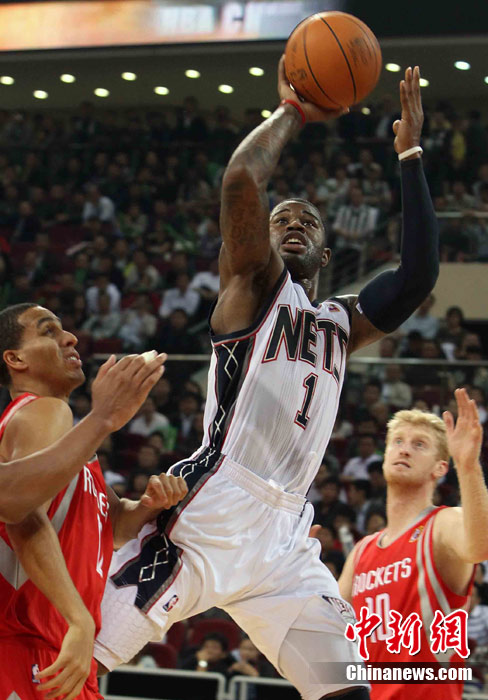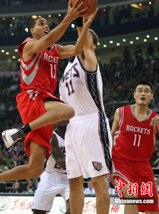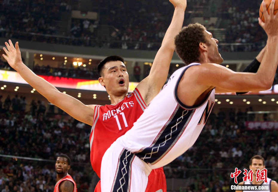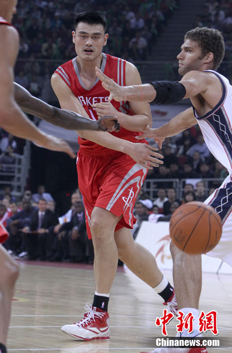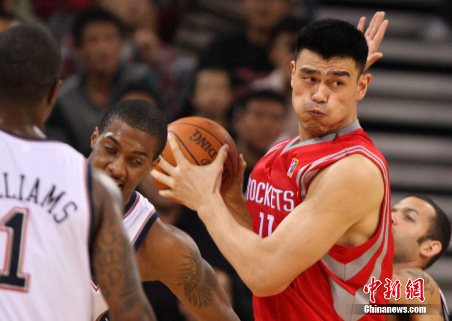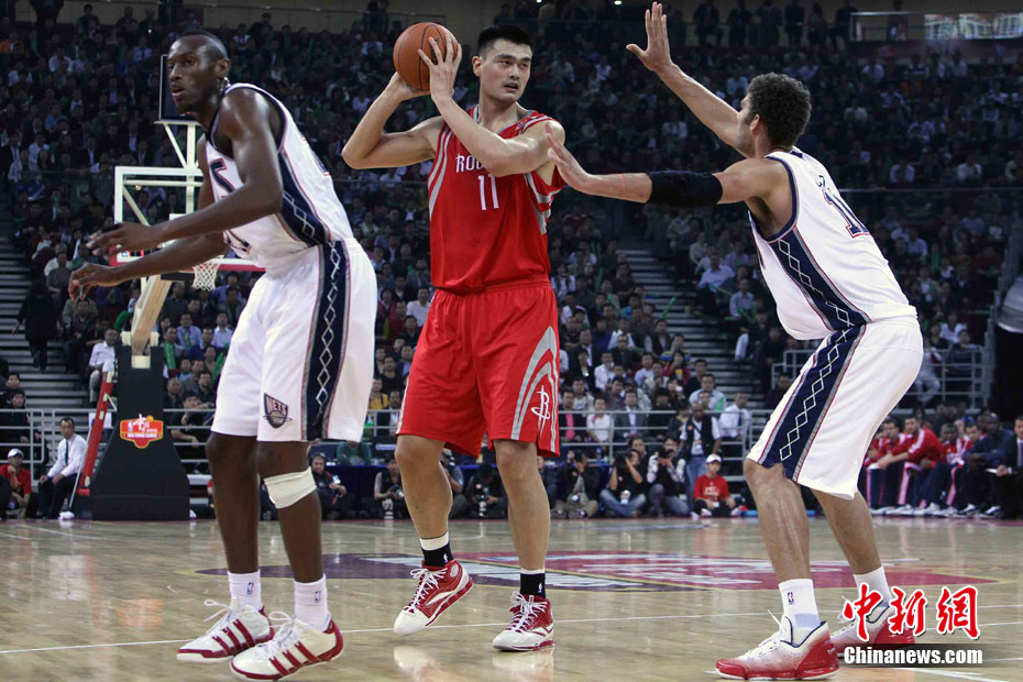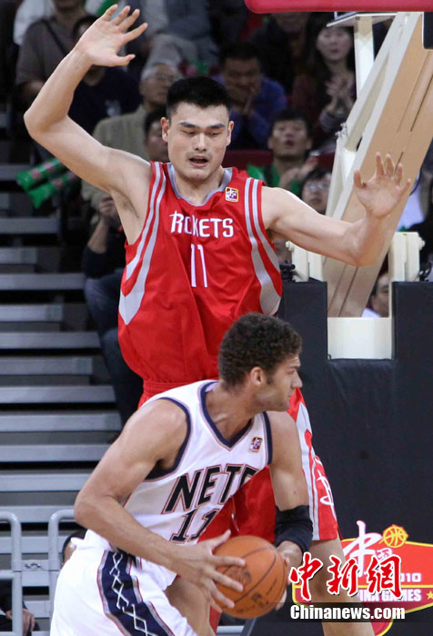 10月13日,NBA中國賽第一場比賽在北京五棵松體育館舉行,休斯敦火箭隊迎戰(zhàn)新澤西網隊。兩支球隊將于本月16日在廣州進行第二場比賽。圖為姚明熱身后在場邊休息。圖片來源:CFP視覺中國