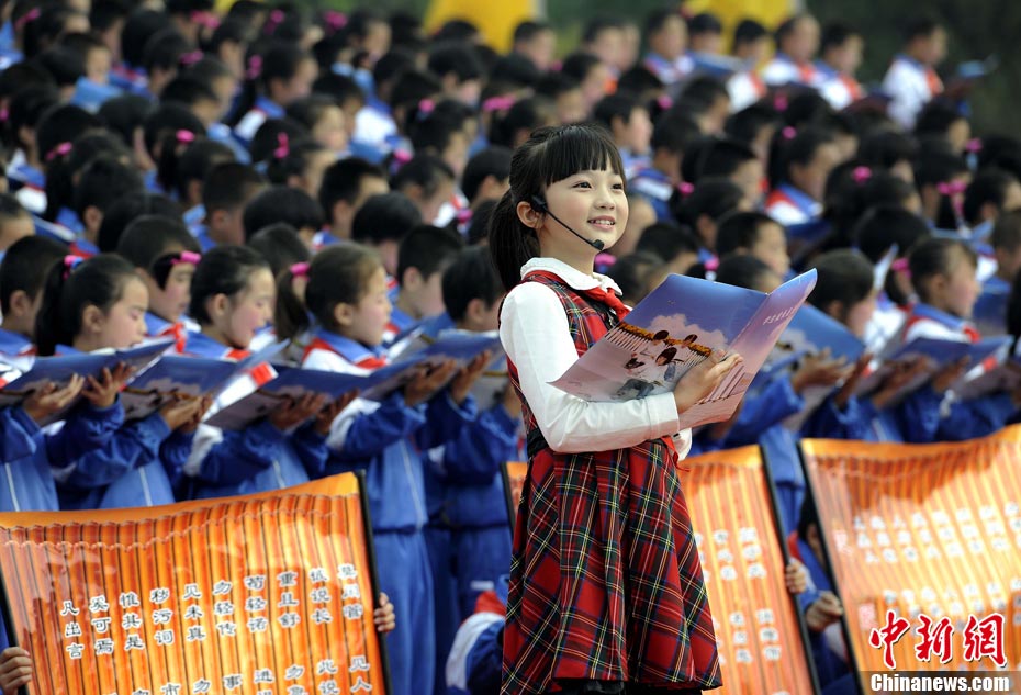 10月16日,運(yùn)城舜帝德孝文化節(jié)在山西省運(yùn)城市鹽湖區(qū)鳴條舜帝陵開幕。舜帝以其獨(dú)特的歷史地位和杰出的歷史功績,被后人尊崇為“百孝之首”、“道德之祖”和“文明之元”,本屆文化節(jié)主題也定義為“德政千秋、孝行天下”。圖為運(yùn)城千名小學(xué)生齊誦《弟子規(guī)》。中新社發(fā) 劉震 攝