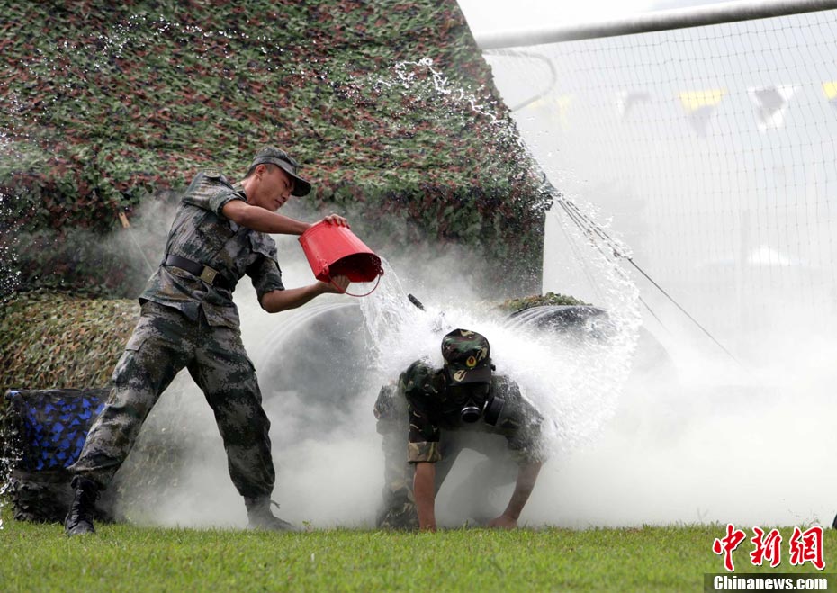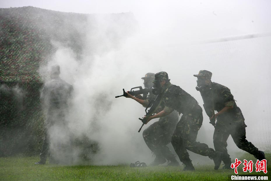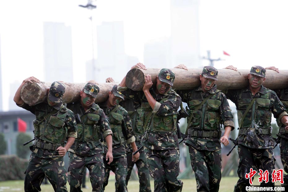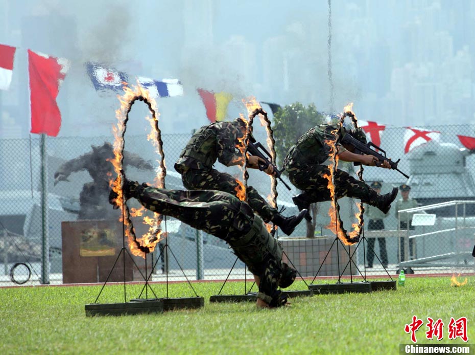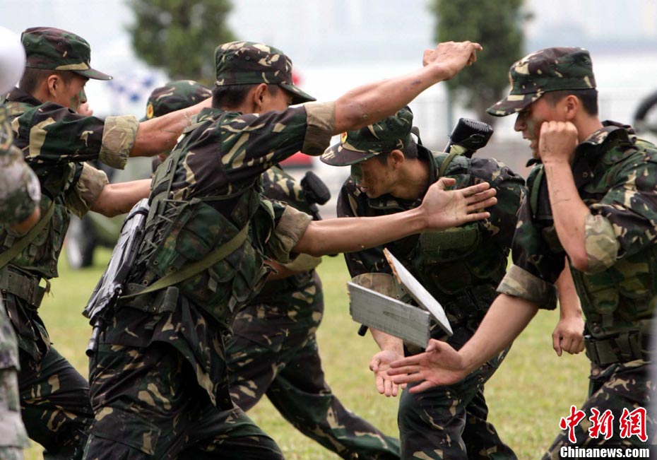 10月16日,中國人民解放軍駐港部隊特種兵在香港昂船洲海軍基地進行“獵人戰(zhàn)斗”演練,展示過硬的搏擊功夫。當天,駐軍與香港各大院校大學生聯(lián)誼活動,以各種形式相互交流,增進香港學生對國家的了解。 中新社發(fā) 洪少葵 攝