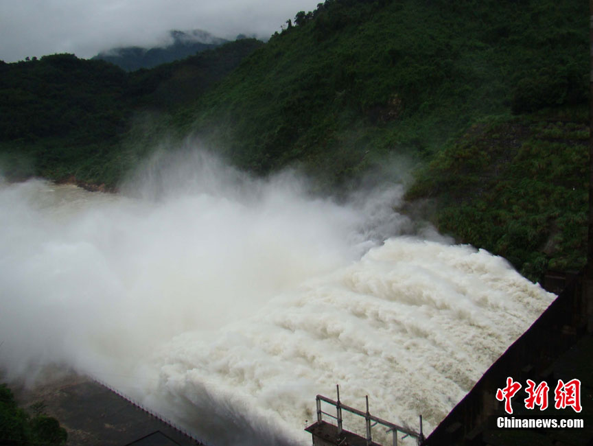 10月16日9時(shí),受持續(xù)強(qiáng)降雨影響,瓊海市牛路嶺水庫(kù)最高水位達(dá)105.16米,超過(guò)防洪限制水位105米,牛路嶺水庫(kù)水電站打開(kāi)7個(gè)閘門(mén),以每秒3000立方米流量泄洪到萬(wàn)泉河。當(dāng)日上午,瓊海市政府緊急將萬(wàn)泉河沿岸7鄉(xiāng)鎮(zhèn)群眾緊急轉(zhuǎn)移。中新社發(fā) 付美斌 攝