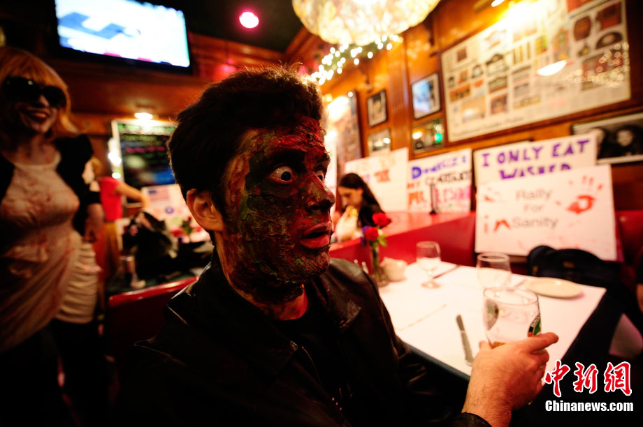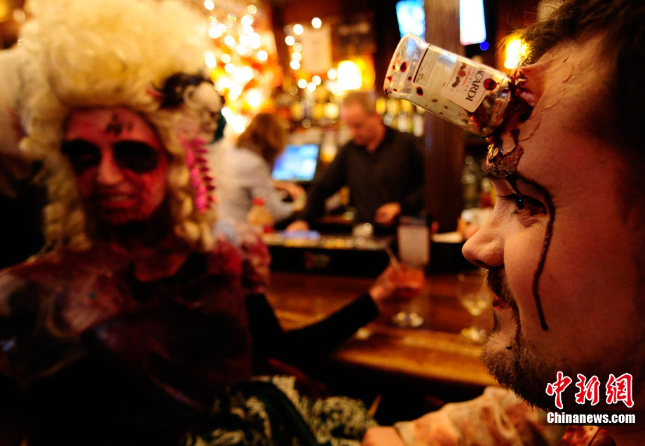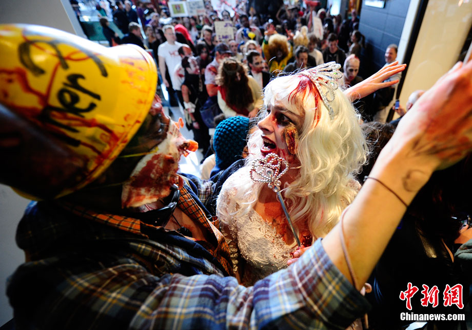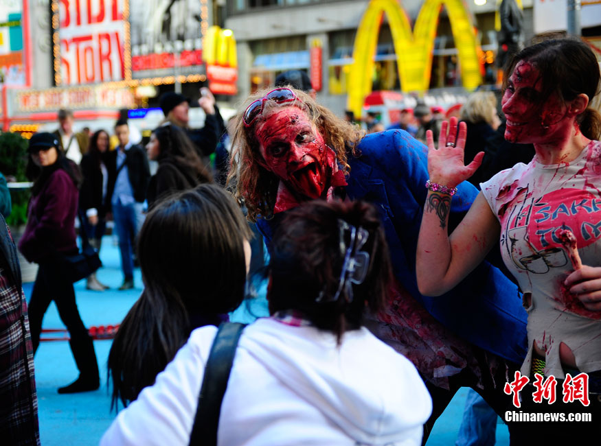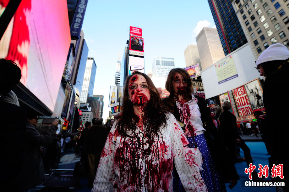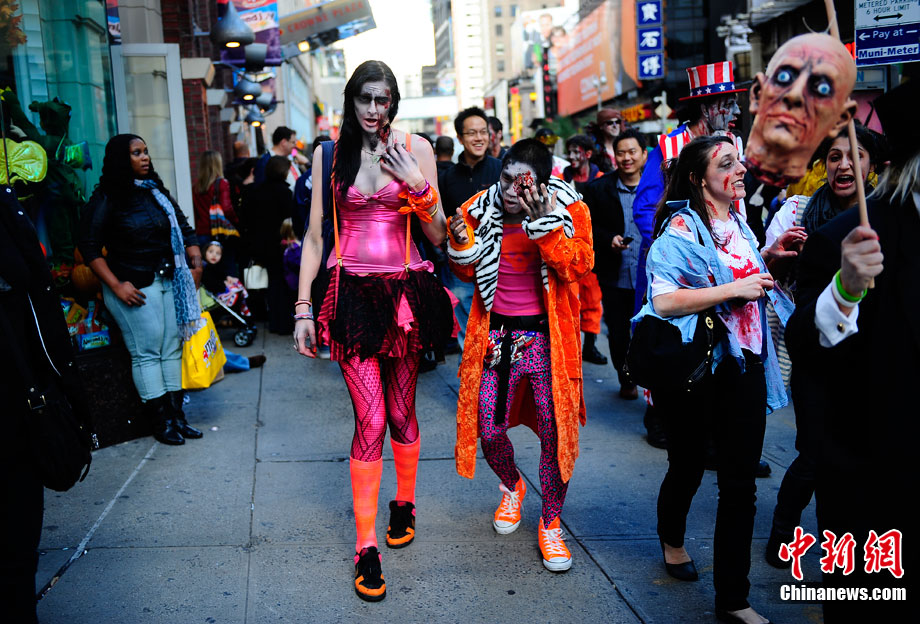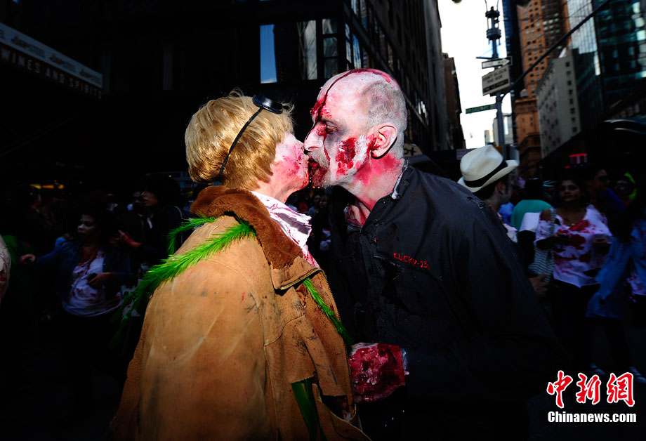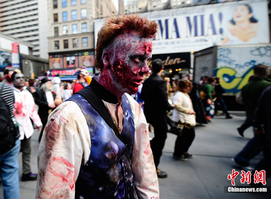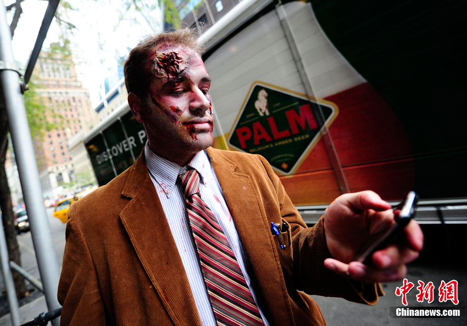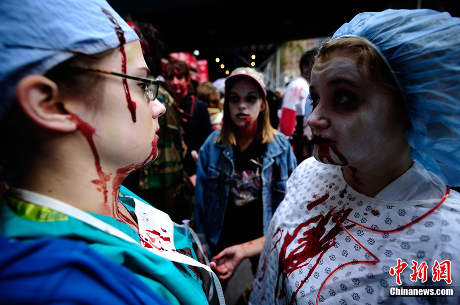 當(dāng)?shù)貢r(shí)間10月16日,美國(guó)紐約曼哈頓舉行了盛大的僵尸大游行。數(shù)百名狂歡者將自己打扮成僵尸模樣嚇唬路上的民眾。