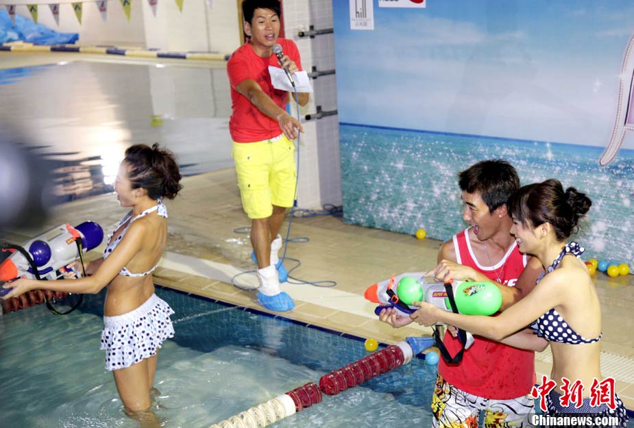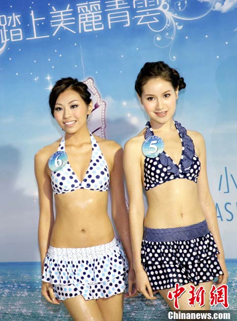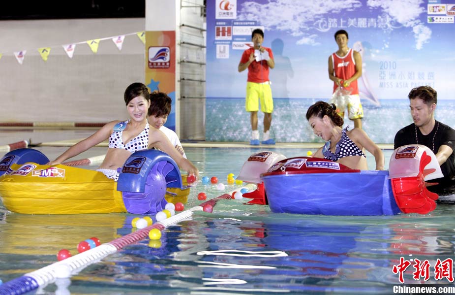 10月19日,參加《2010亞洲小姐競(jìng)選》(港澳賽區(qū))的9號(hào)佳麗陳明月(右)和10號(hào)佳麗何婭換上泳裝,進(jìn)行水上競(jìng)技,以各種游戲方式放松心情去迎接總決賽。中新社發(fā) 洪少葵 攝