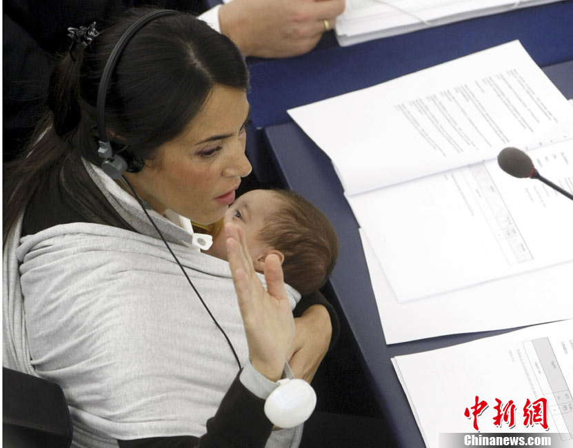 10月20日,歐洲議會在法國的斯特拉斯堡為延長產(chǎn)假的提案舉行投票,代表麗希亞·隆蘇依帶著孩子出席會議。