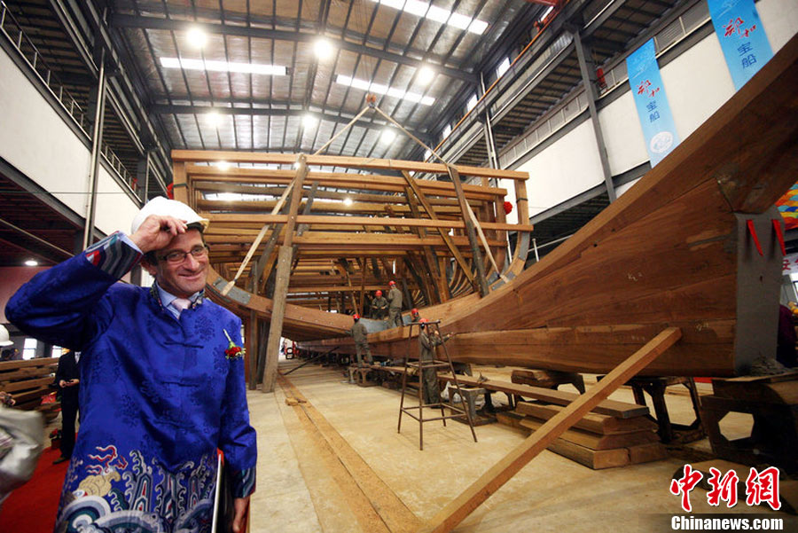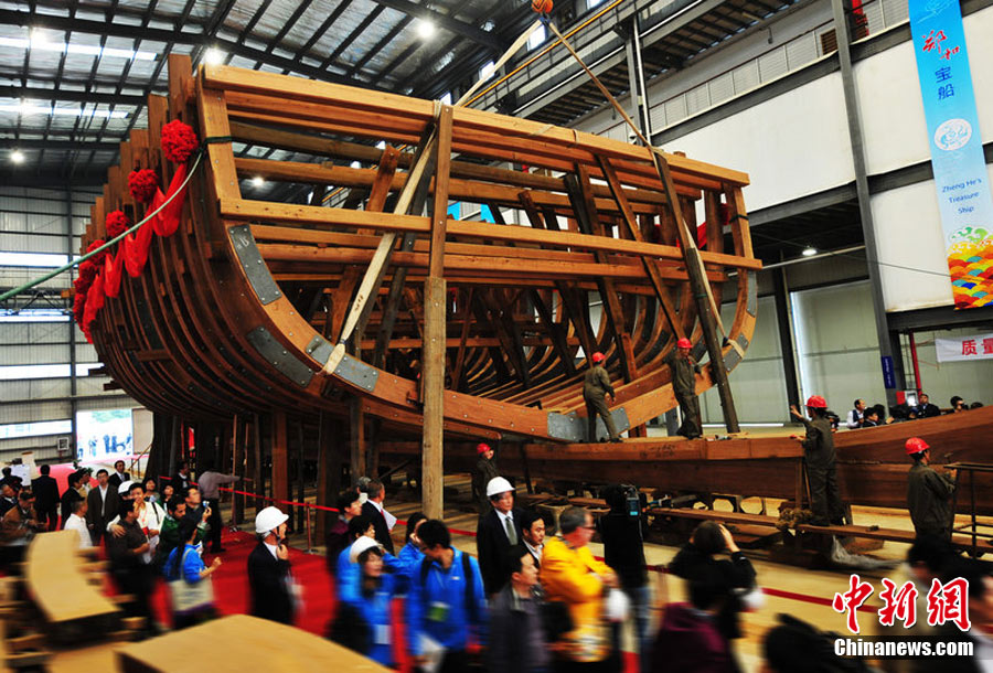 10月20日,南京,作為“2010年南京名城會”的序曲,“鄭和寶船復(fù)建慶典”在鄭和寶船廠舉行,主體已經(jīng)完工1/3的“鄭和寶船”露出“廬山真面目”。這座鄭和寶船將在明年9月船體竣工,2013年將沿著鄭和當(dāng)年的航海路線“環(huán)球航行”。圖為復(fù)建的寶船進行了肋骨安放儀式。邵丹 攝 圖片來源:CFP視覺中國