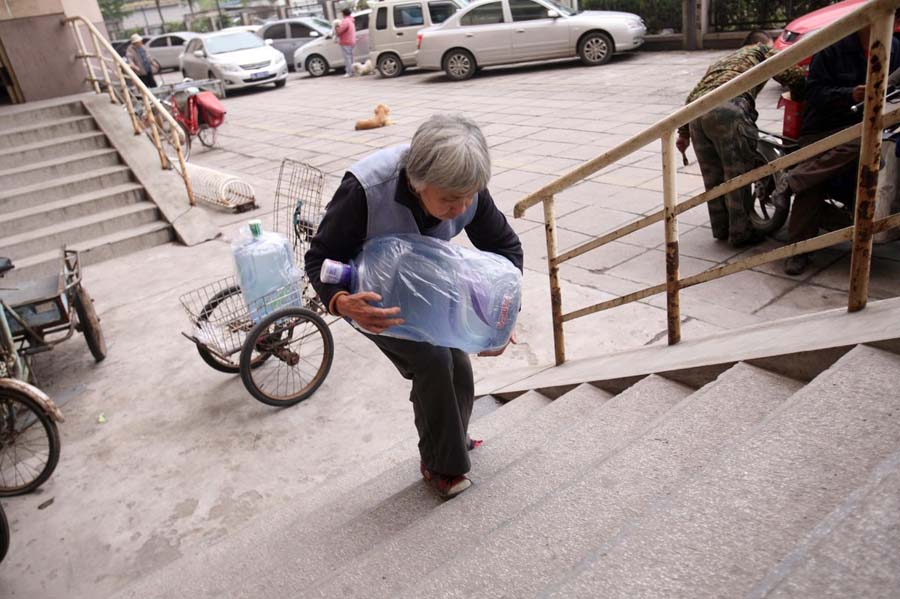 年至七旬的高美運(yùn),為了糊養(yǎng)全家、為兒孫治病,每天都要重復(fù)這個(gè)動(dòng)作近百次。40斤的水桶在這個(gè)只有75斤的老人面前,實(shí)在是太沉了。為了養(yǎng)活身殘的兒子和智障的孫子,七十歲的老人高美運(yùn)獨(dú)自扛起了養(yǎng)活一家人的重?fù)?dān)。為了生計(jì),她開了一家水站,成了石景山區(qū)楊莊中區(qū)社區(qū)里有名的“送水老太太”。