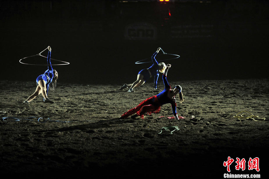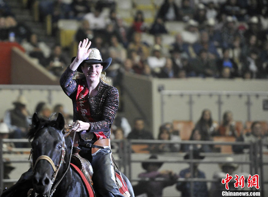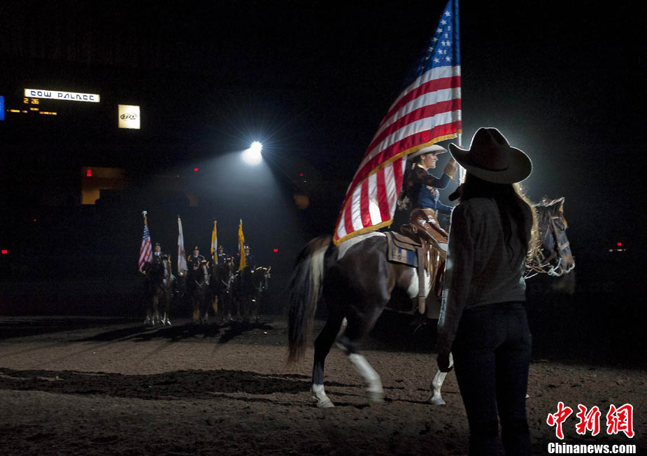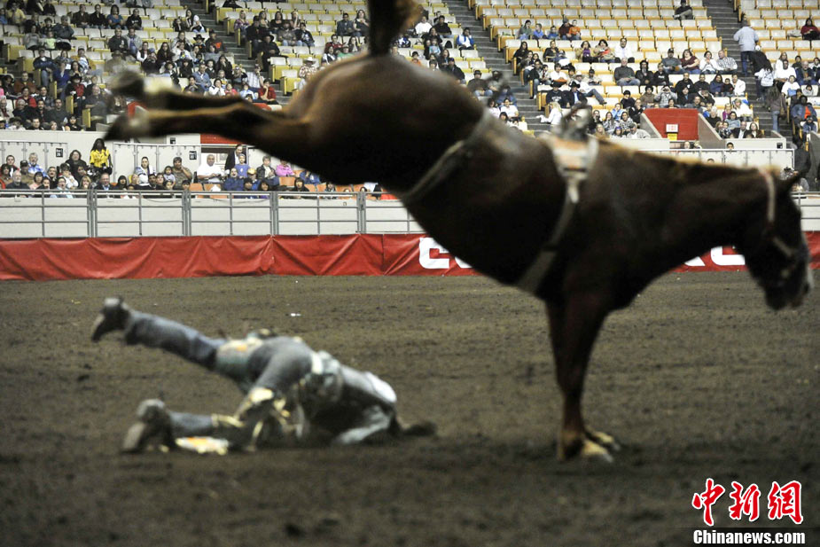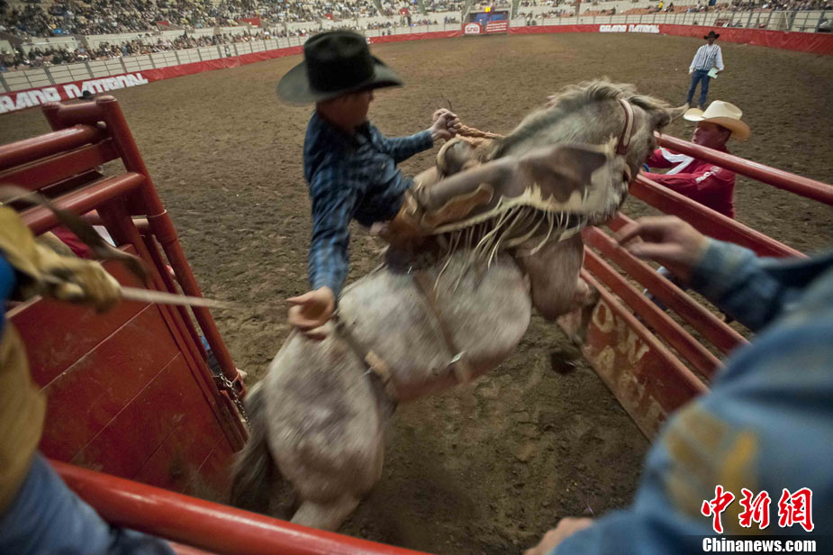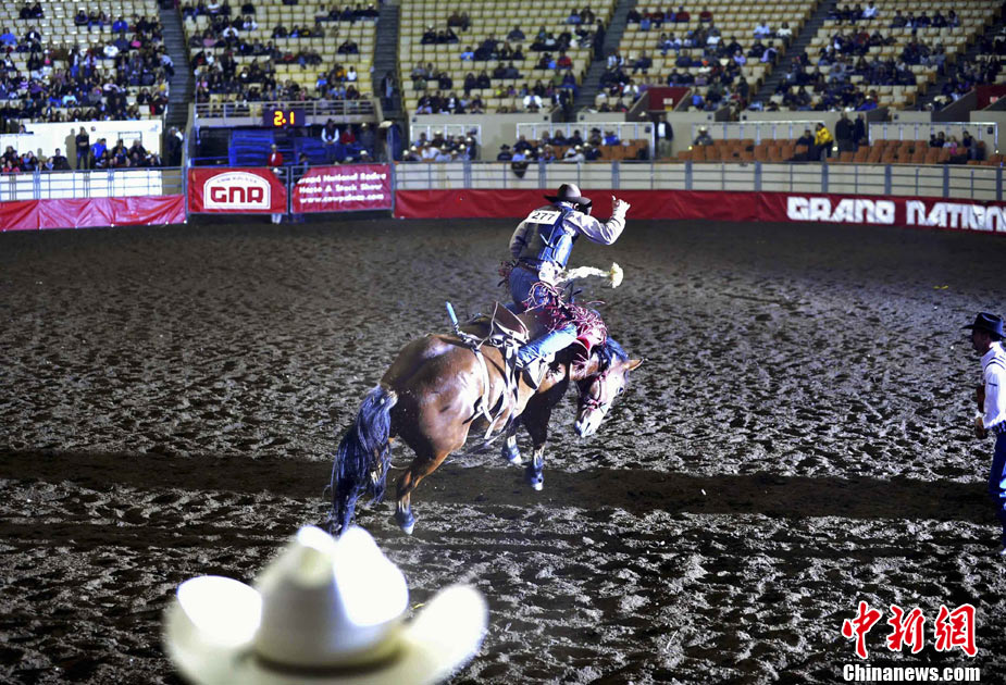 為期四日的全美騎術(shù)大會(huì)在舊金山的牛宮(Cow Palace)舉行。來自全美多個(gè)州的專業(yè)和草根牛仔參加表演,舉辦者預(yù)測將會(huì)吸引兩萬名左右的觀眾前來參觀。舊金山的全美騎術(shù)大會(huì)始于1941年,是全美專業(yè)騎術(shù)大會(huì)的前奏。圖為一名牛仔在努力馴服烈馬。中新社發(fā) 陳鋼 攝
