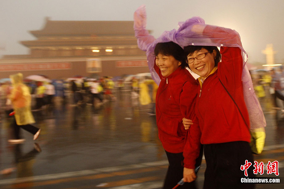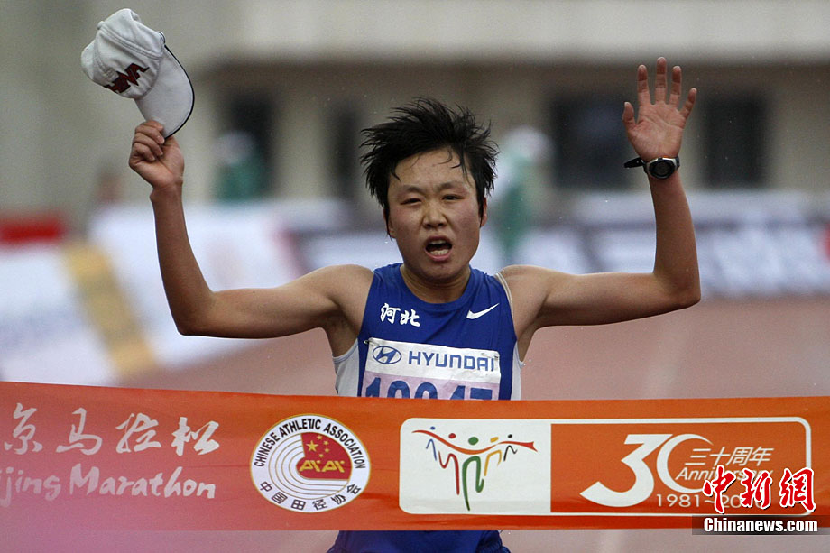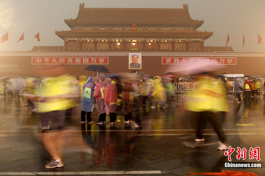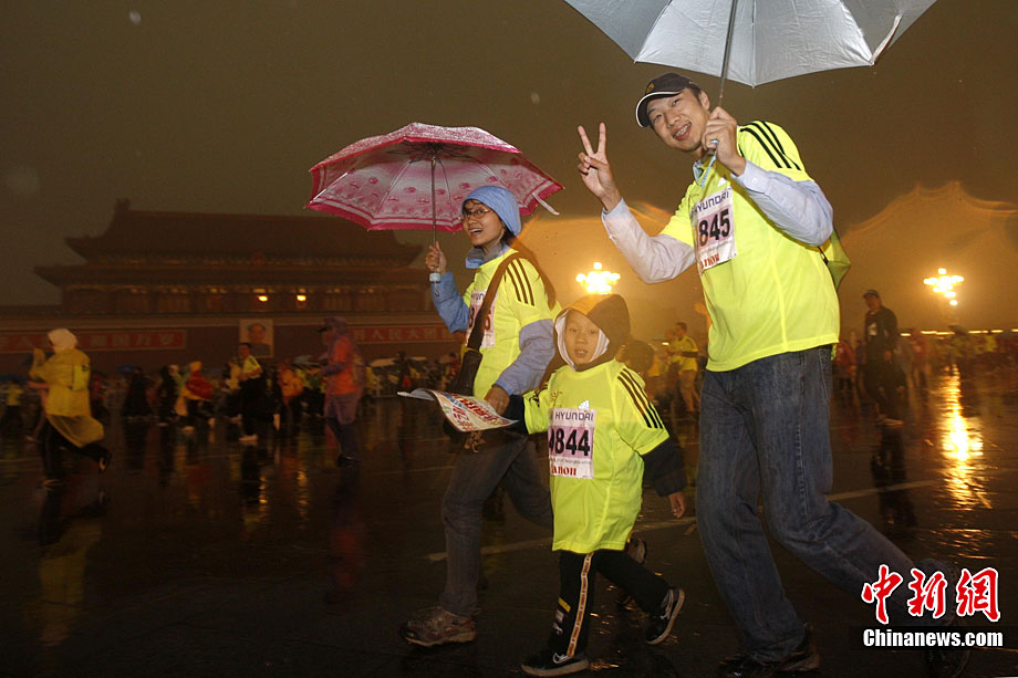 10月24日8時,2010年北京馬拉松正式鳴槍,所有參賽運(yùn)動員在淅淅瀝瀝的小雨中從天安門廣場出發(fā)。今年的北京馬拉松正式與國際接軌,與往年不同的特點是北京馬拉松賽、全國馬拉松錦標(biāo)賽以及首都高校馬拉松賽“三賽合一”,并采取一次發(fā)槍制,所有組別的選手都同時出發(fā)。中新社記者 富田 攝
