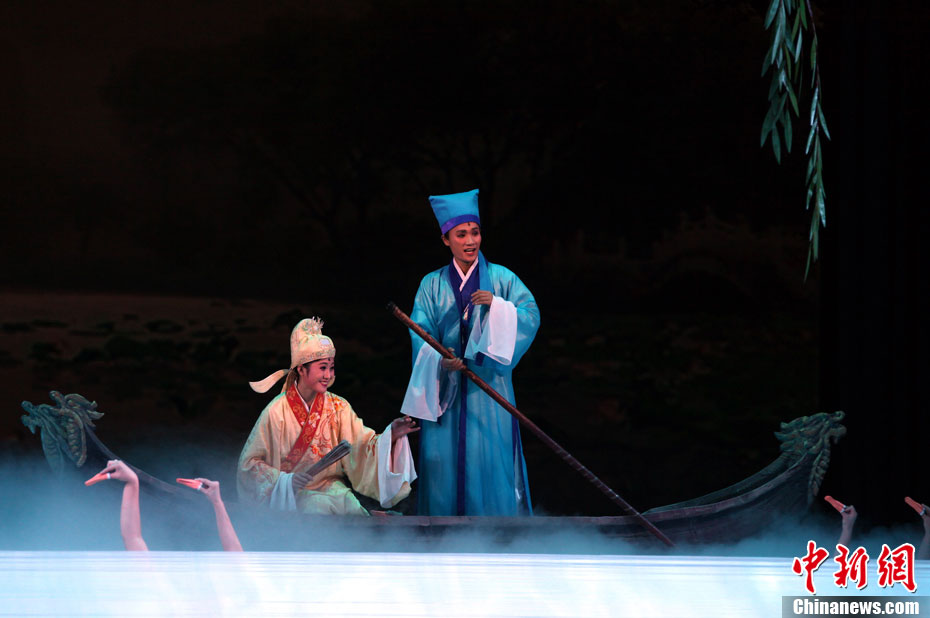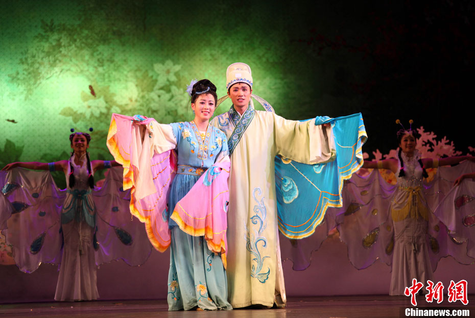 10月24日下午,朝鮮平壤大劇場(chǎng)上演其新排演的歌劇《梁山伯與祝英臺(tái)》。為紀(jì)念中國(guó)人民志愿軍赴朝參戰(zhàn)60周年,朝鮮血海歌劇團(tuán)把中國(guó)民間傳說(shuō)《梁山伯與祝英臺(tái)》改編成歌劇。圖為該歌劇中“梁祝化蝶”的精彩片段。中新社發(fā) 孫自法 攝