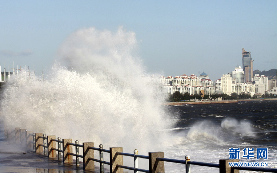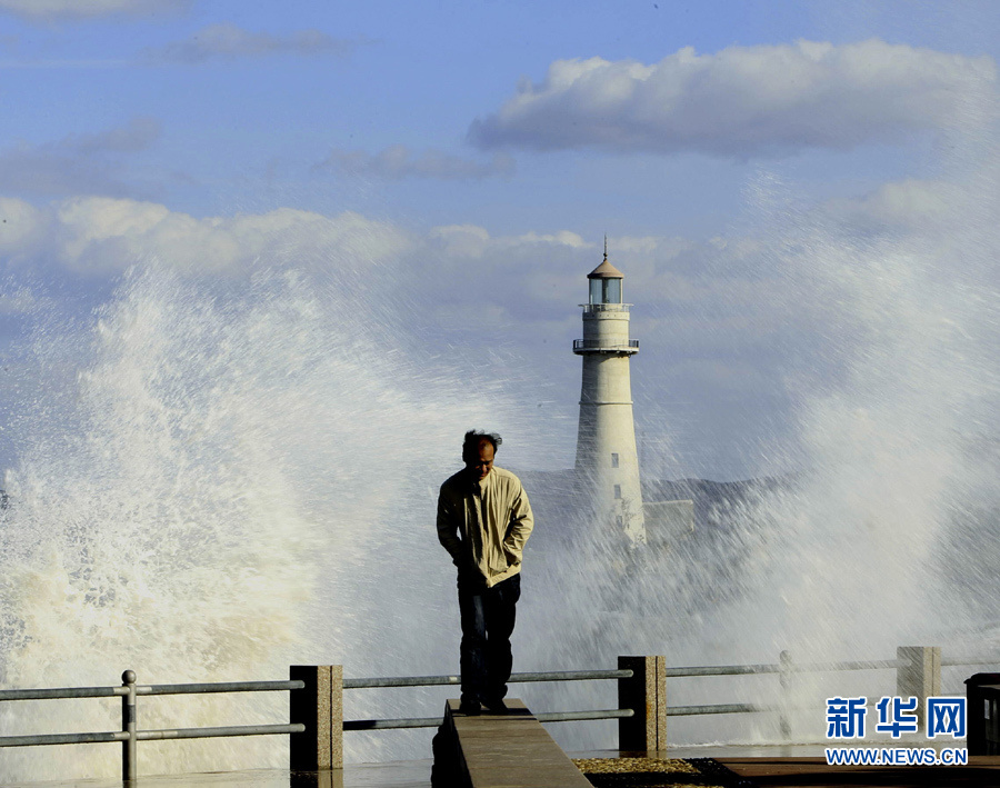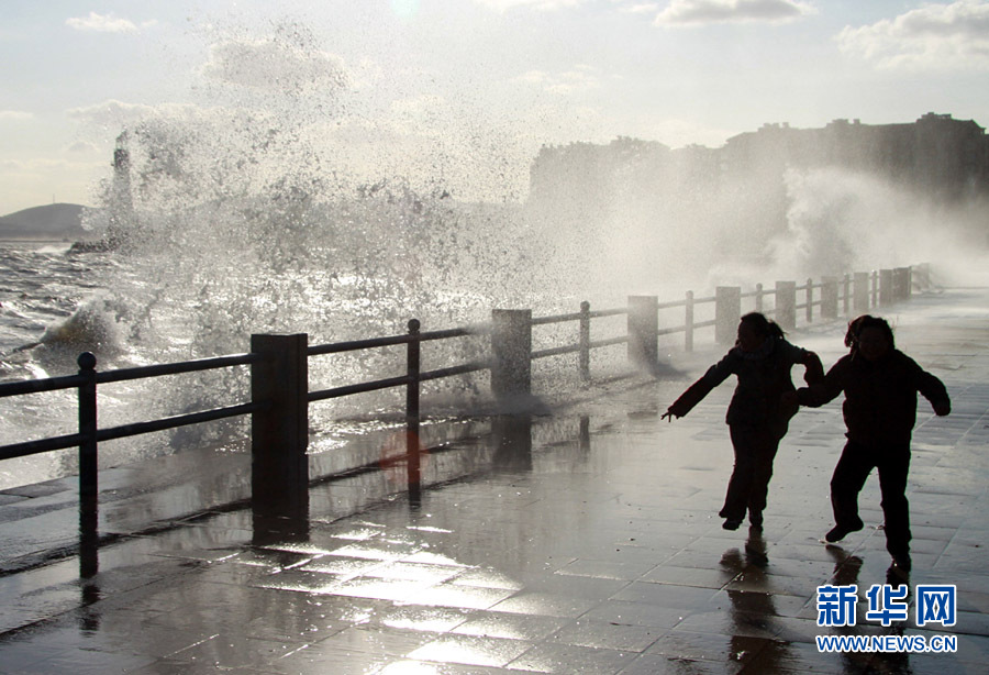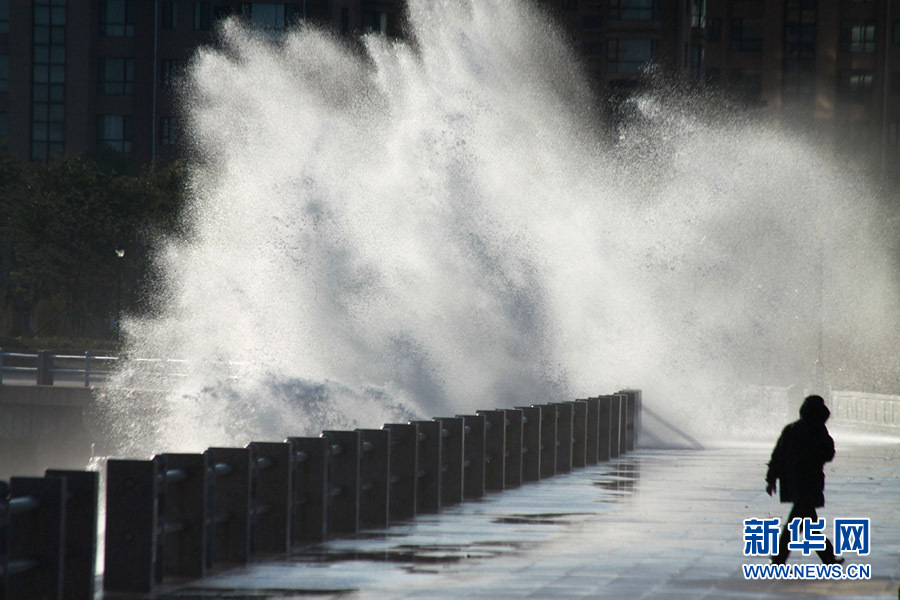 10月25日,一名行人從山東威海海濱掀起的浪花旁走過。當(dāng)日,受強(qiáng)冷空氣影響,山東威海海上風(fēng)力達(dá)8至9級,陣風(fēng)風(fēng)力達(dá)到11級,海濱大浪排空,威海市海上搜救中心發(fā)布海上風(fēng)險(xiǎn)黃色預(yù)警。于啟波 攝 圖片來源:新華網(wǎng)