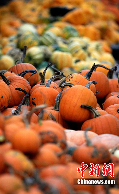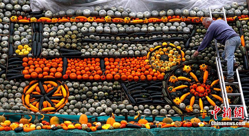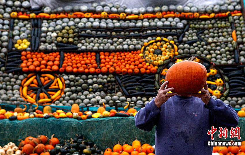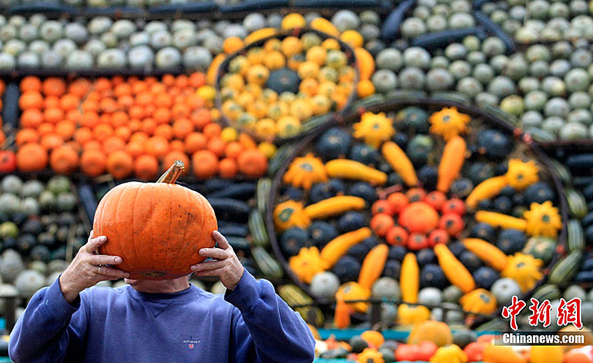 萬(wàn)圣節(jié)到來(lái)的前夕,英國(guó)斯林登老農(nóng)托尼·史密斯將自己種植數(shù)百只南瓜堆成牽引機(jī)車(chē)的模型。