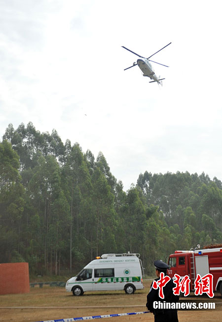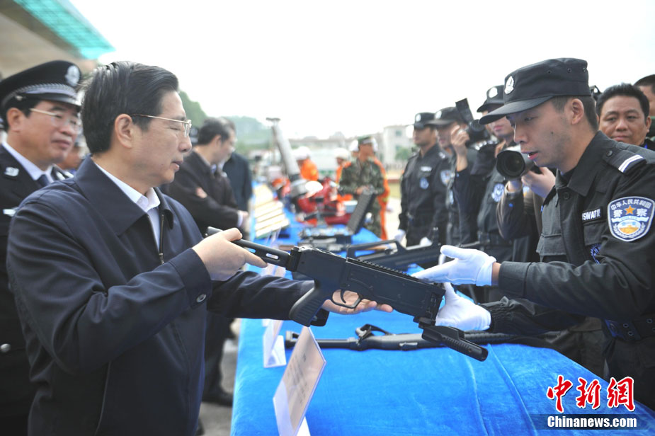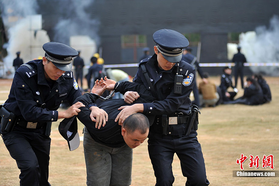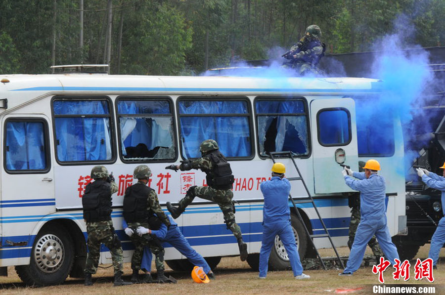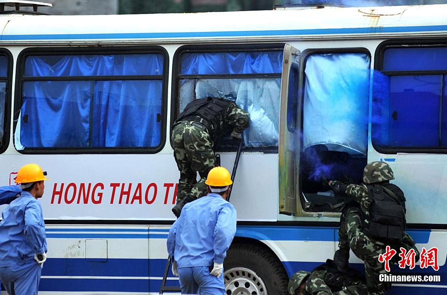 10月28日,廣西舉行亞運安保反恐演練。在演習中,警方采用了多種先進反劫持設備,模擬各種突發(fā)狀況。圖為演練被劫持大巴人質解救過程。廣西共有八條通道通往廣東,是環(huán)粵亞運安保的重點地區(qū)之一。中新社記者 蔣雪林 攝