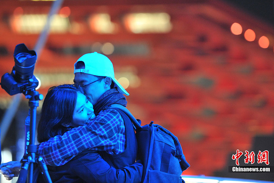 10月30日,上海世博會閉幕前夜,一對年青戀人深夜擁吻在世博園中國館前,沉浸于美好夜色里不忍離去。中新社記者 賈國榮 攝