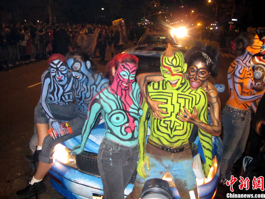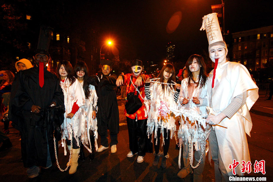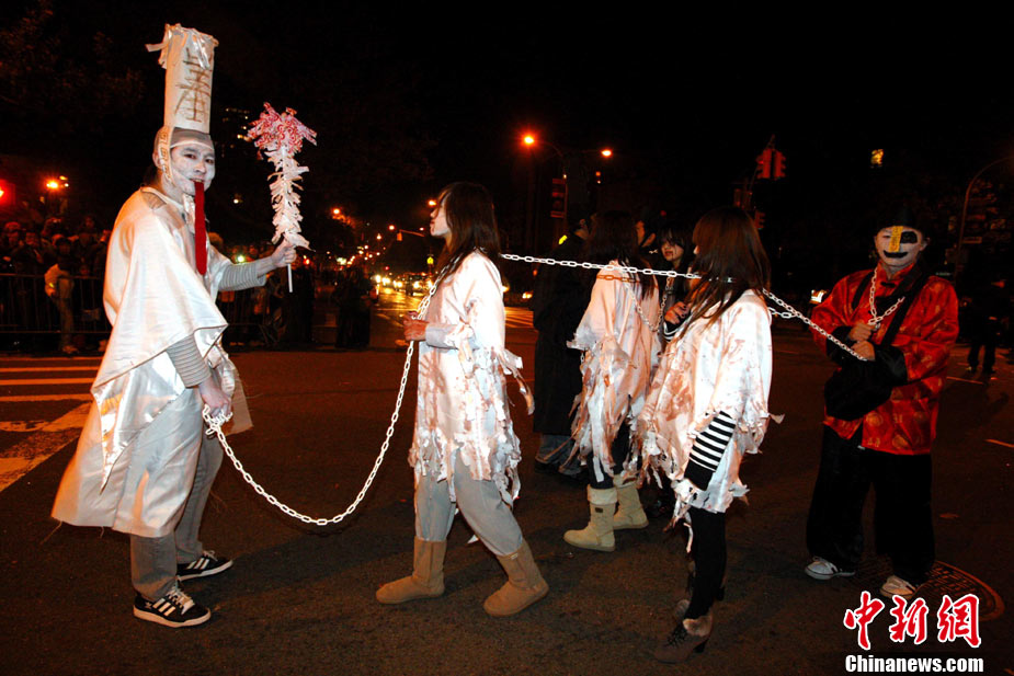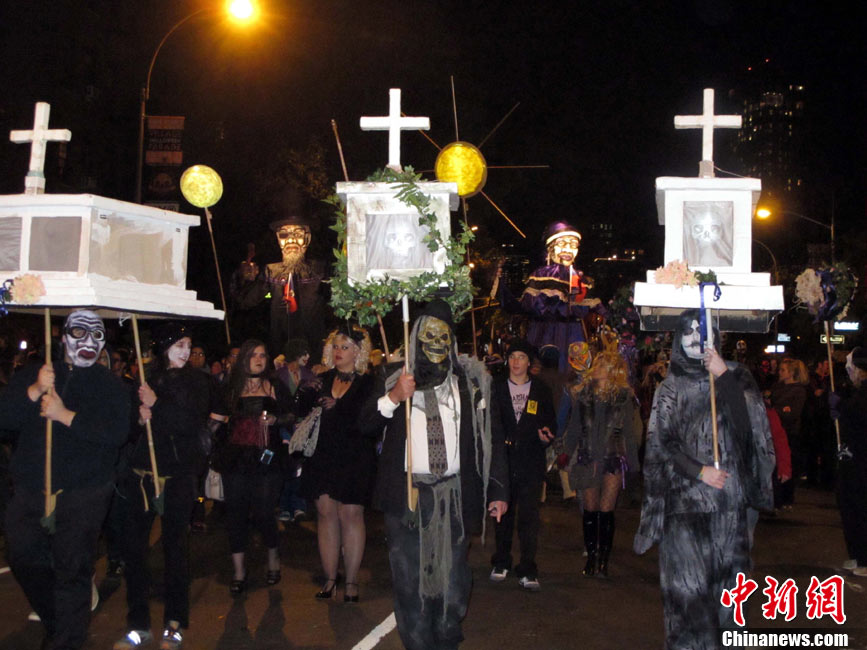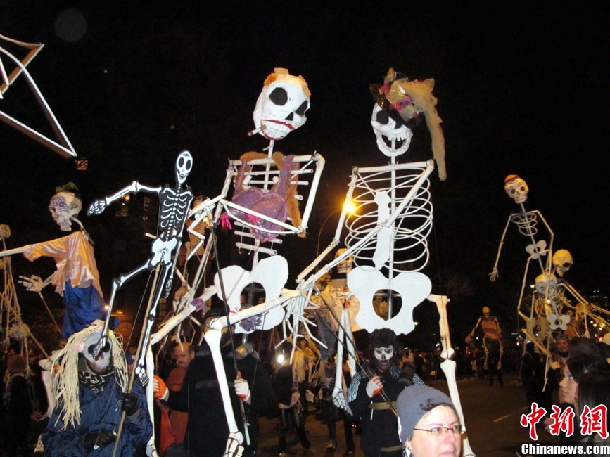 當?shù)貢r間10月31日晚,一年一度的紐約萬圣節(jié)前夜狂歡大游行在紐約第六大道舉行,這是全世界最大的萬圣節(jié)游行。中新社記者 孫宇挺 攝
