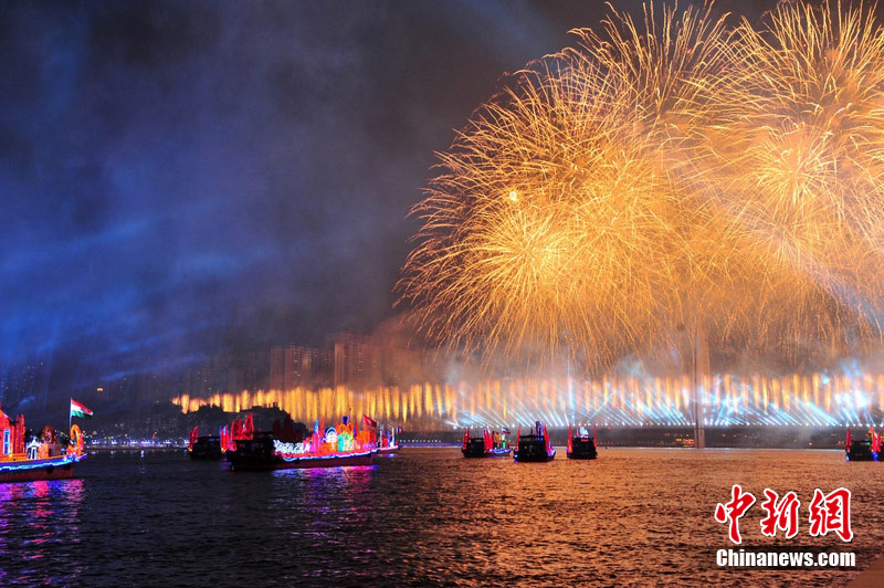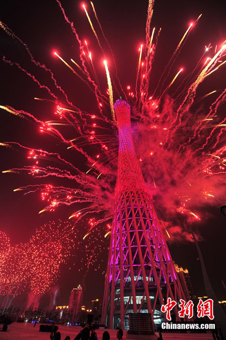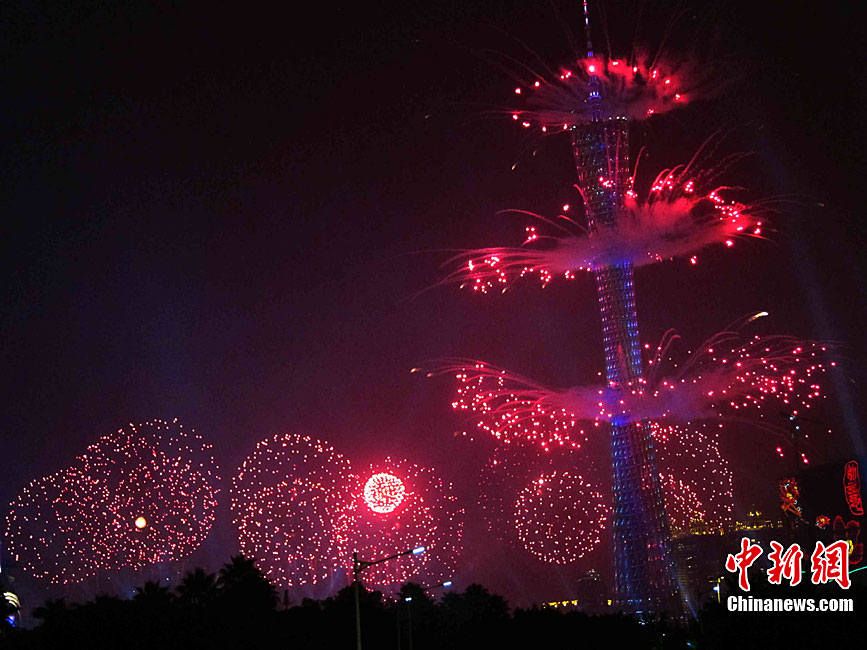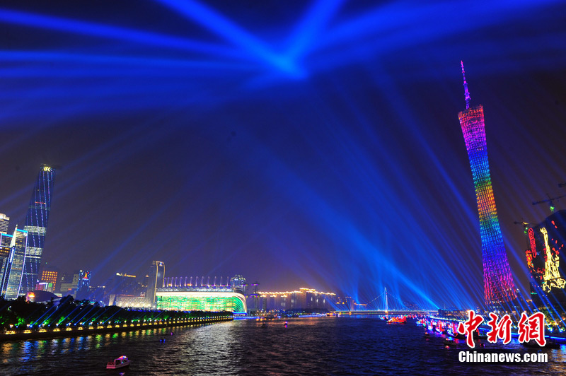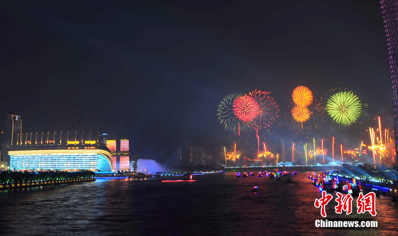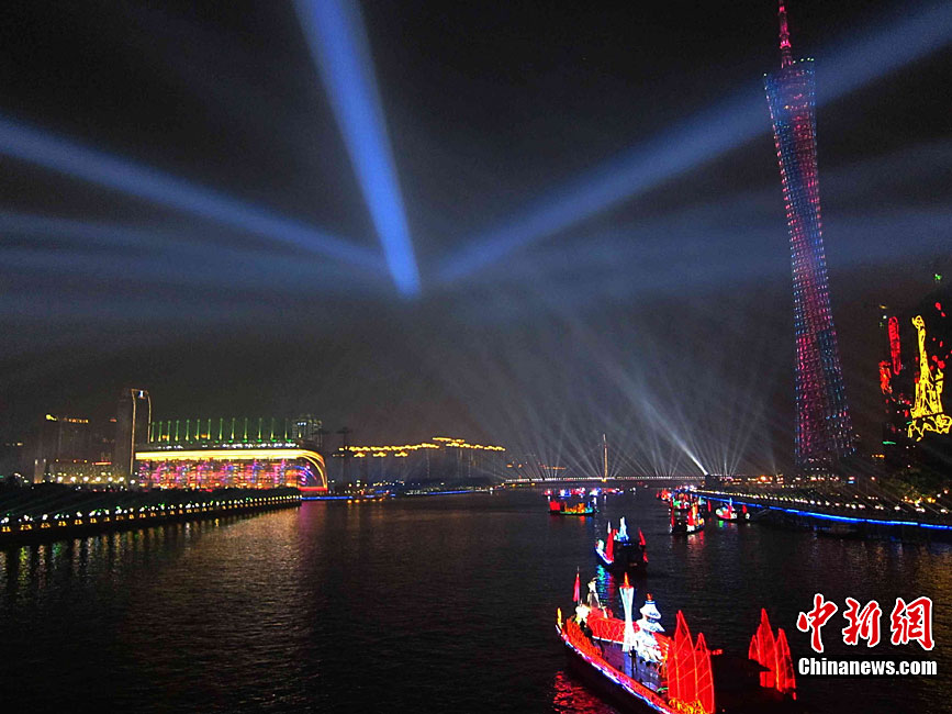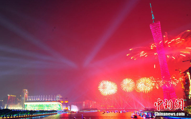 2010年11月3日晚,廣州海心沙上演包括煙花預(yù)演在內(nèi)的亞運(yùn)開(kāi)幕式帶妝彩排。圖片來(lái)源:CFP視覺(jué)中國(guó)