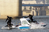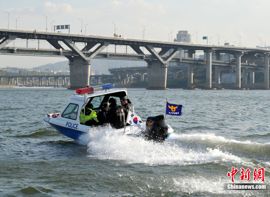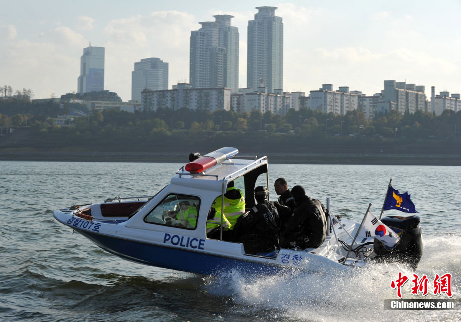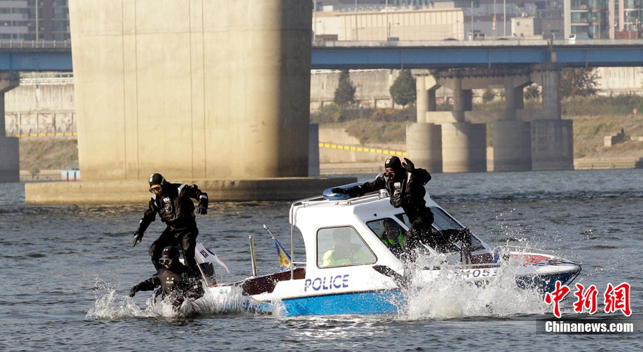 當(dāng)?shù)貢r(shí)間11月3日,韓國(guó)首爾附近的漢江中韓國(guó)水警舉行了針對(duì)G20峰會(huì)安保工作的演練。