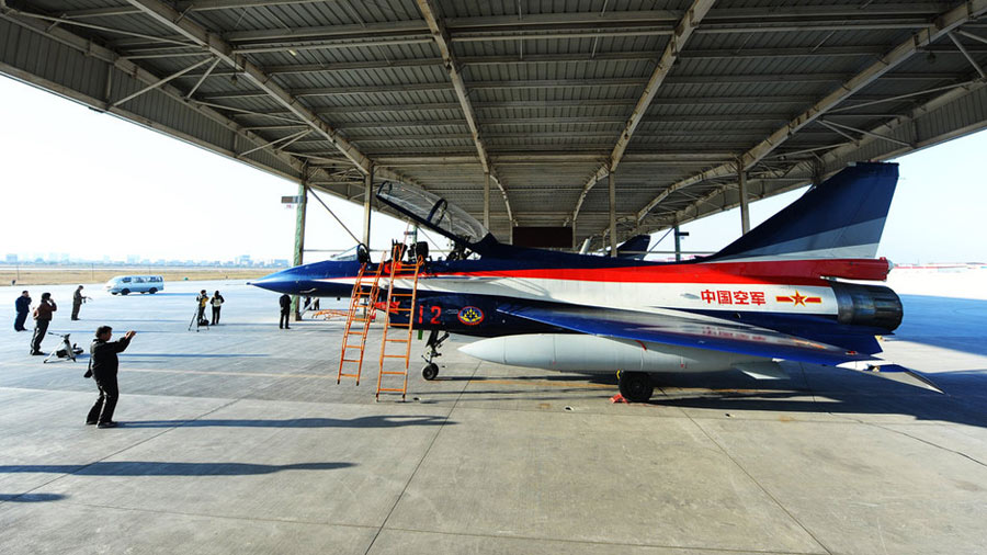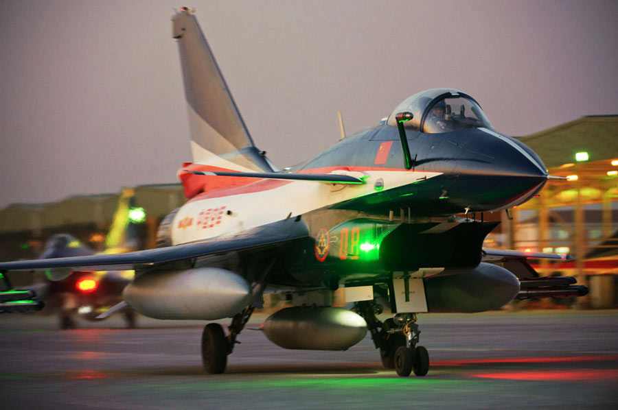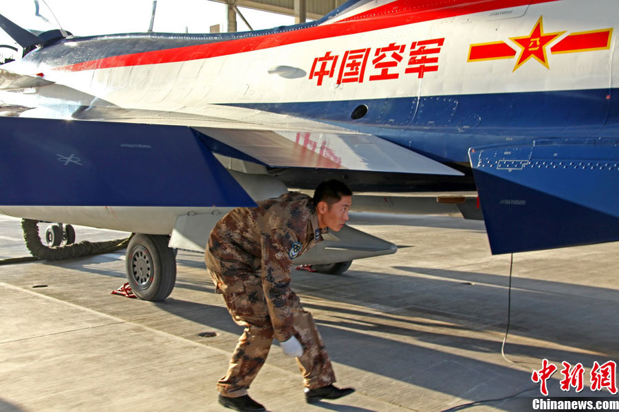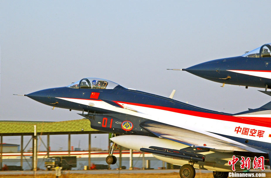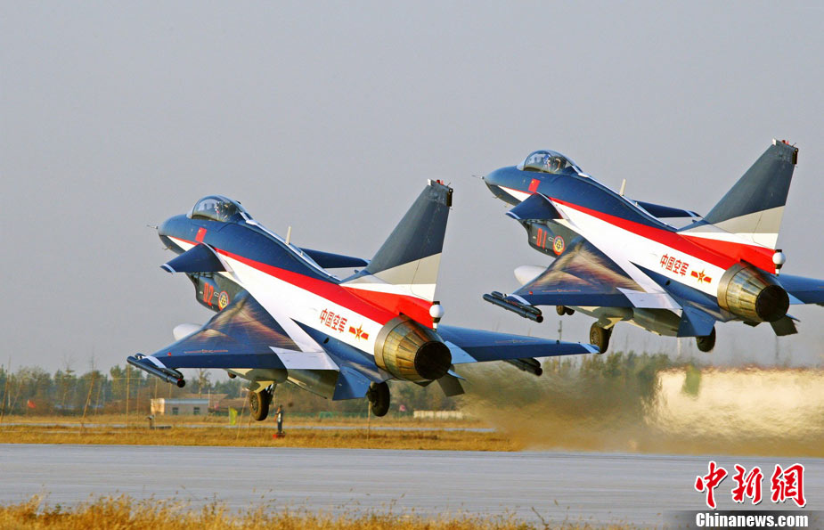 11月初,中國空軍八一飛行表演隊新涂裝的殲10飛機雙機起飛。空軍八一飛行表演隊7架殲—10戰(zhàn)機近日將飛赴珠海,參加11月16日至21日舉行的第8屆中國國際航空航天博覽會(珠海航展)。這是表演隊換裝殲—10戰(zhàn)機后,首次以新涂裝向世人正式亮相?哲娺將派出殲—8F、殲轟—7A、轟—6H、空警—200、直—8KA、直—9WA等7型飛機,參加這次國際性綜合航展。中新社發(fā) 譚超 攝