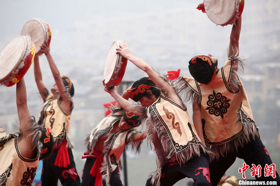 圖為汶川青年跳羊皮鼓舞歡慶羌?xì)v年。中新社發(fā) 張浪 攝