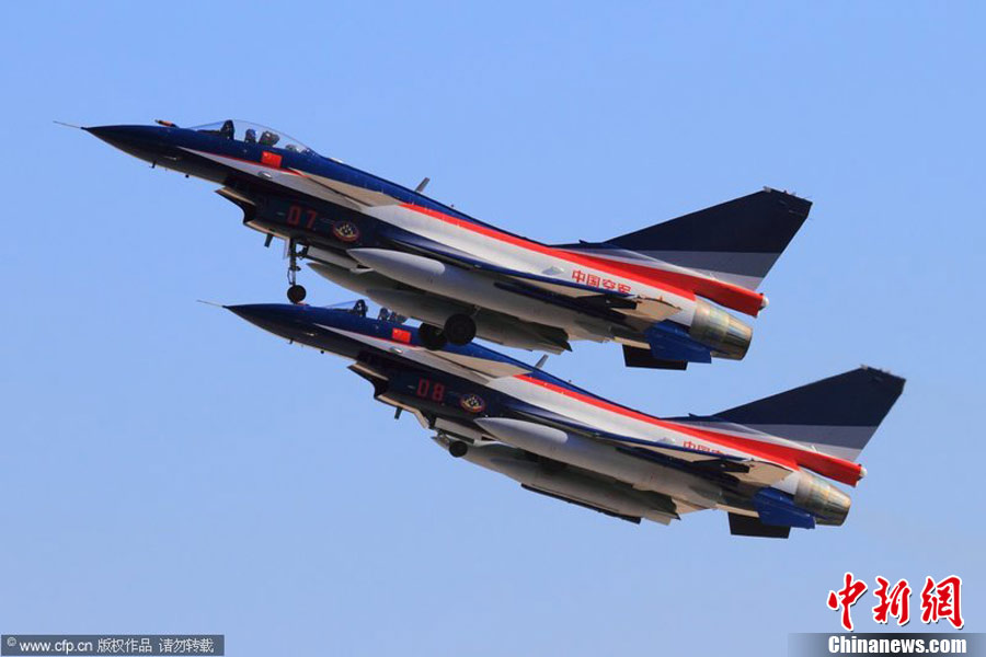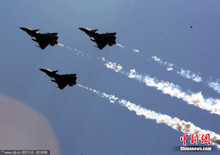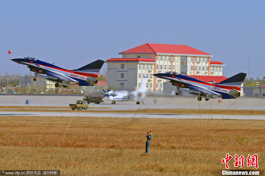 2010年11月8日,中國空軍“八一”飛行表演隊的7架殲十表演機從華北某機場起飛,經(jīng)過約2個半小時的飛行,飛抵珠海三灶機場。將在珠海航展上進行一系列的精彩特技表演。林森 攝 圖片來源:CFP視覺中國