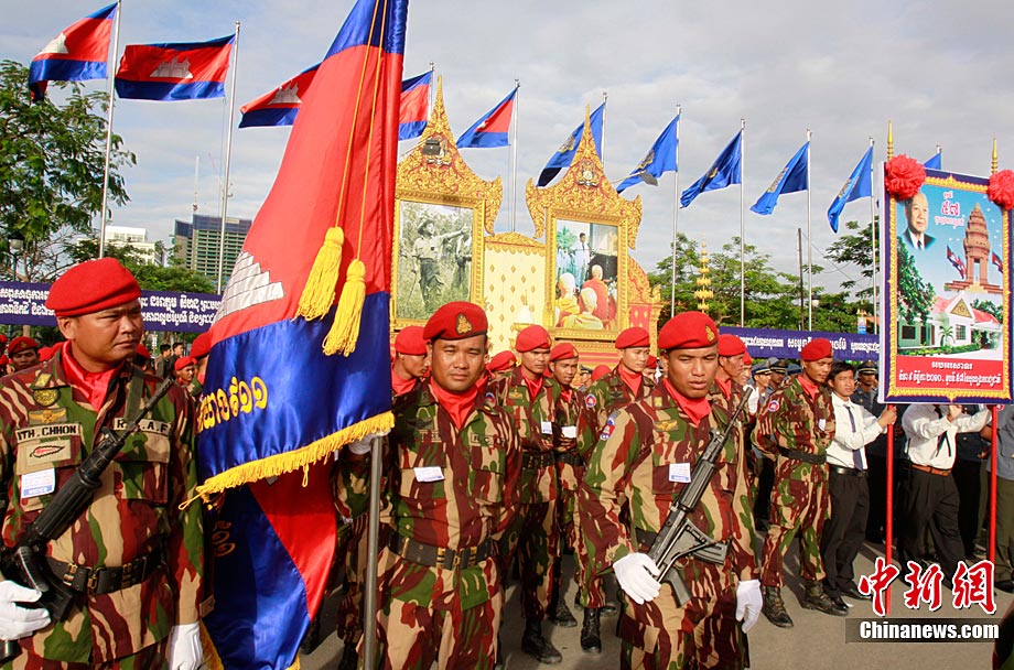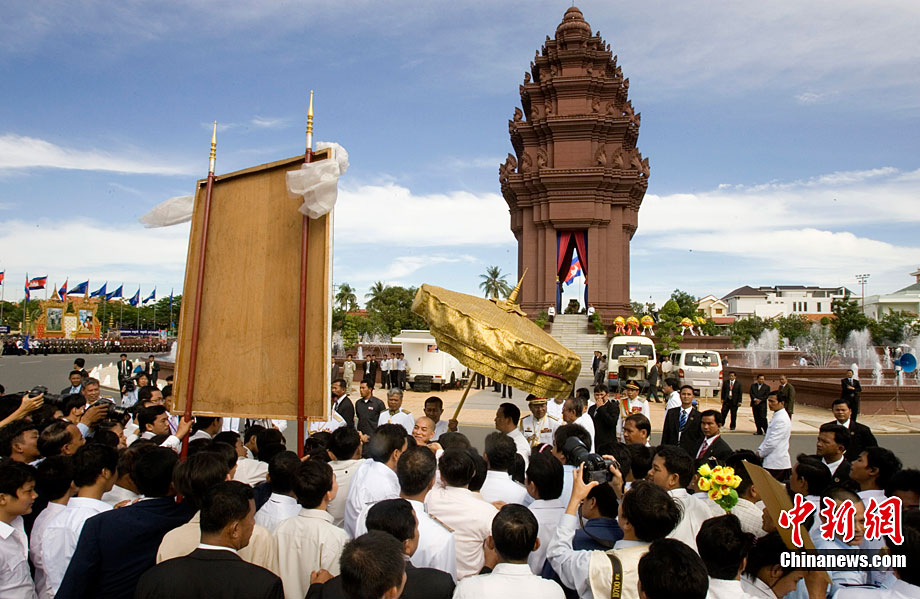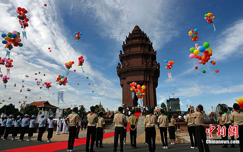 11月9日,工作人員在獨(dú)立節(jié)慶祝儀式上放飛彩球。當(dāng)天,柬埔寨在金邊獨(dú)立紀(jì)念碑廣場(chǎng)舉行盛大儀式,熱烈慶祝國(guó)家獨(dú)立57周年。柬埔寨國(guó)王西哈莫尼、國(guó)會(huì)主席韓桑林、政府首相洪森等政要以及各國(guó)駐柬使節(jié)和各界代表約2萬(wàn)人出席儀式。