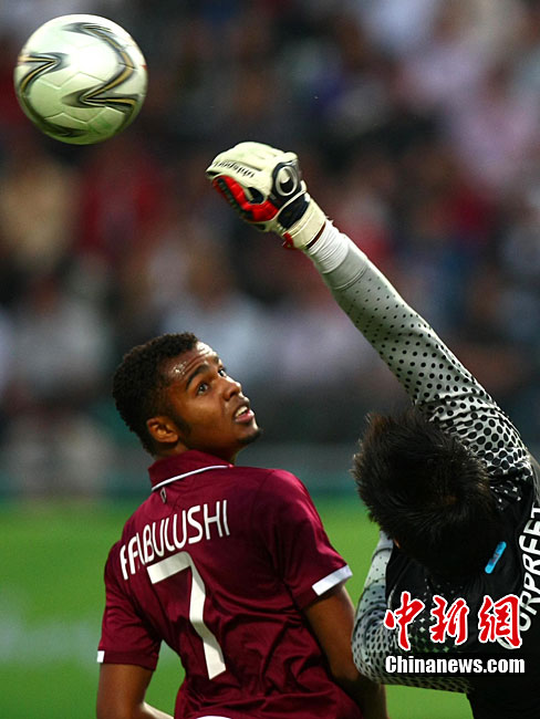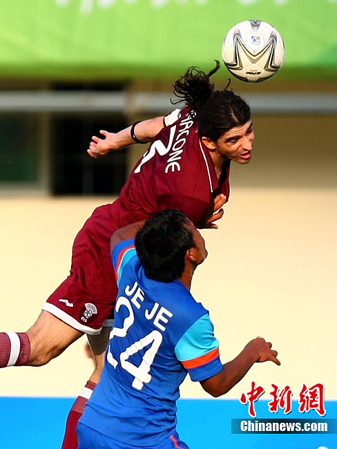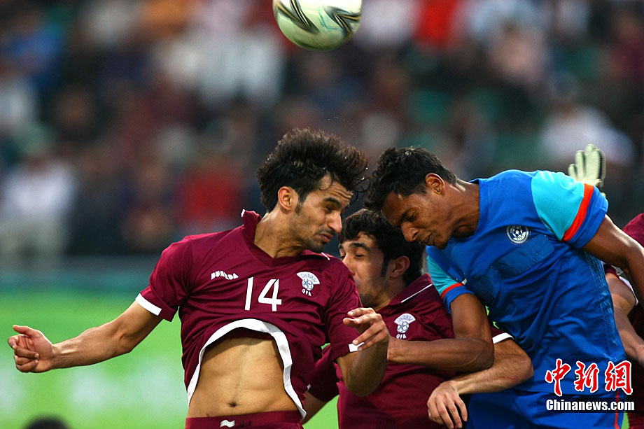 11月9日,第16屆亞運會男足比賽展開D組的一場爭奪,上屆亞運會冠軍卡塔爾隊(紅)在先失一球的情況下實現(xiàn)逆轉,最終以2:1戰(zhàn)勝印度隊。中新社記者 富田 攝