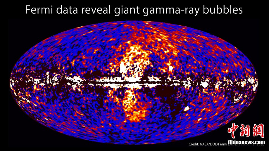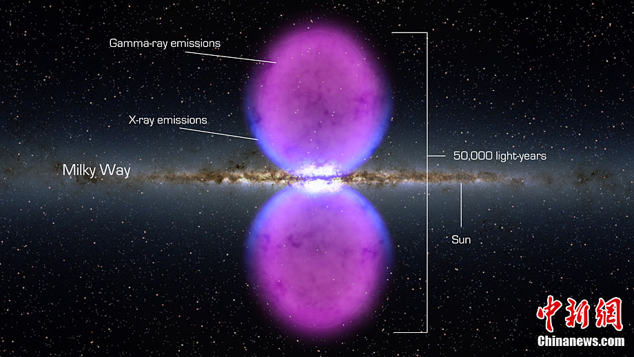 科學(xué)家日前最新探測發(fā)現(xiàn)銀河系中心溢出高能量放射線形成的兩個巨大氣泡,并認(rèn)為這兩個巨大的氣泡源自一個超大質(zhì)量黑洞的噴發(fā)。每個神秘的宇宙氣泡結(jié)構(gòu)直徑跨越25000光年,兩個氣泡連接起來可覆蓋可見夜空一半的區(qū)域,它們噴射著伽馬射線(高能量波長光線)。