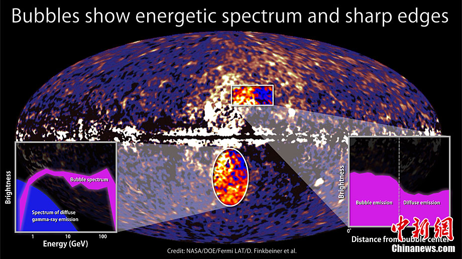 研究人員稱,宇宙氣泡結(jié)構(gòu)表明數(shù)百萬年前存在著爆炸式的恒星誕生,或者它們形成于銀河系中心一個超大質(zhì)量黑洞噴射大量氣體和灰塵之中。美國哈佛-史密遜天體物理學(xué)研究中心的道格-芬克貝涅(Doug Finkbeiner)是該項研究負(fù)責(zé)人,他說:“目前最新發(fā)現(xiàn)的銀河系巨大氣泡結(jié)構(gòu)仍存在著謎團(tuán),我們并不能完全理解它的特性或者起源!