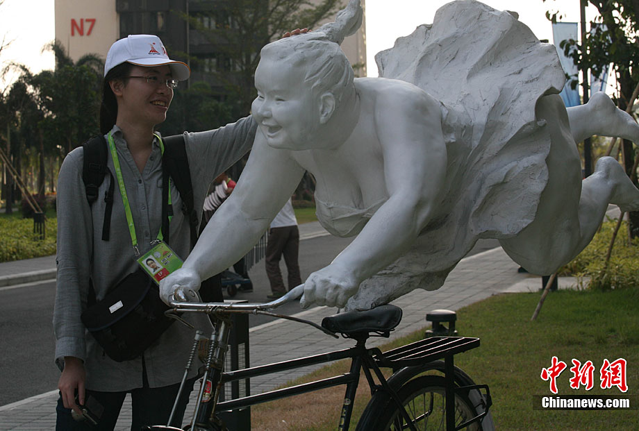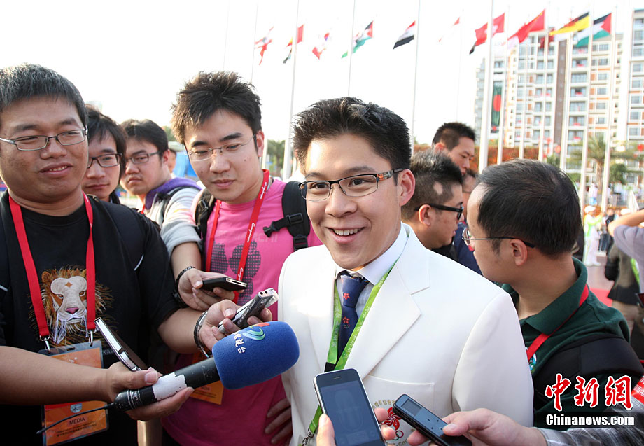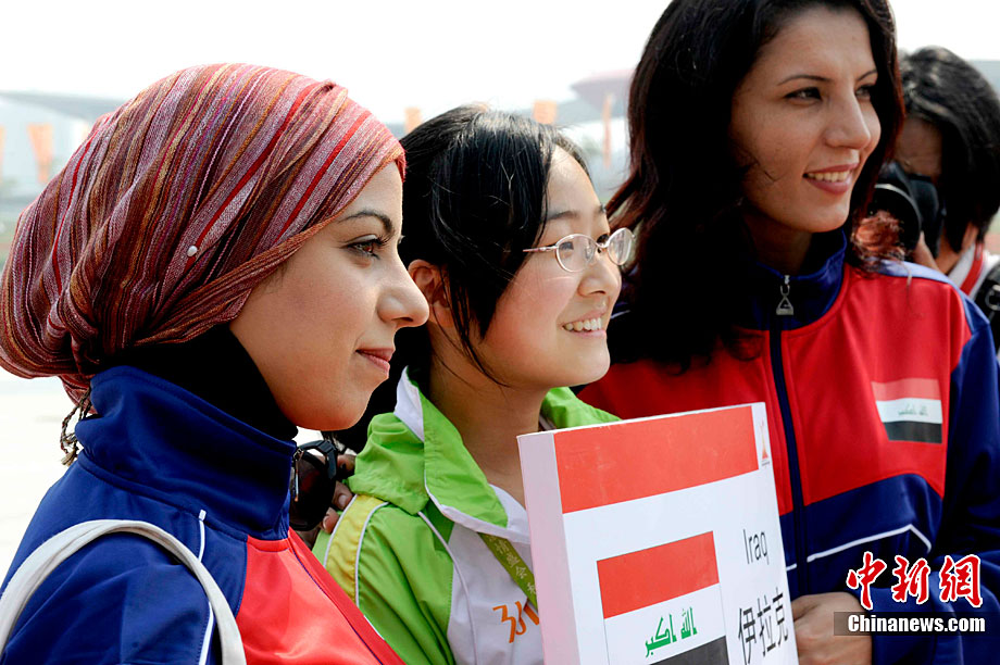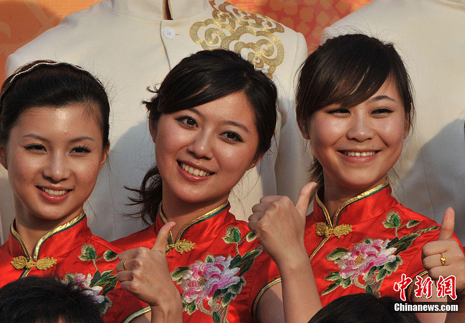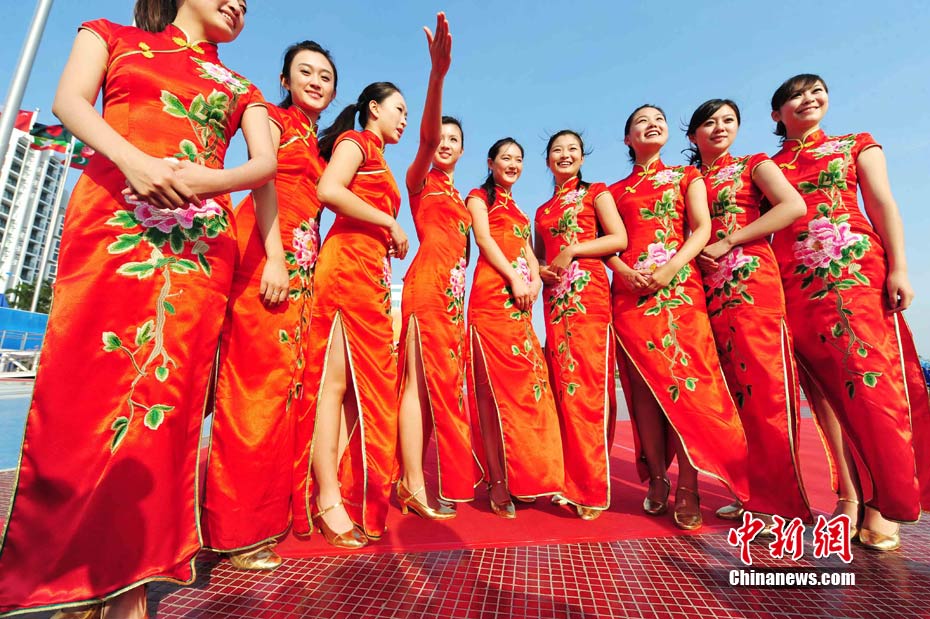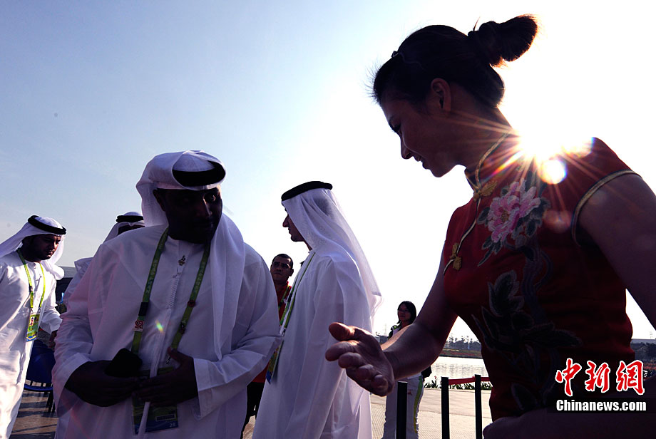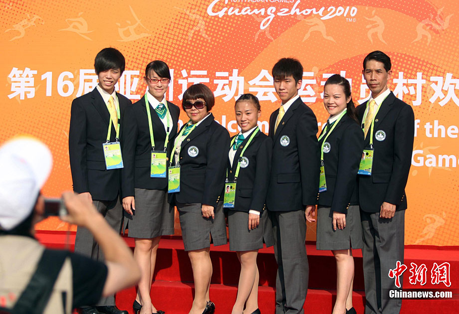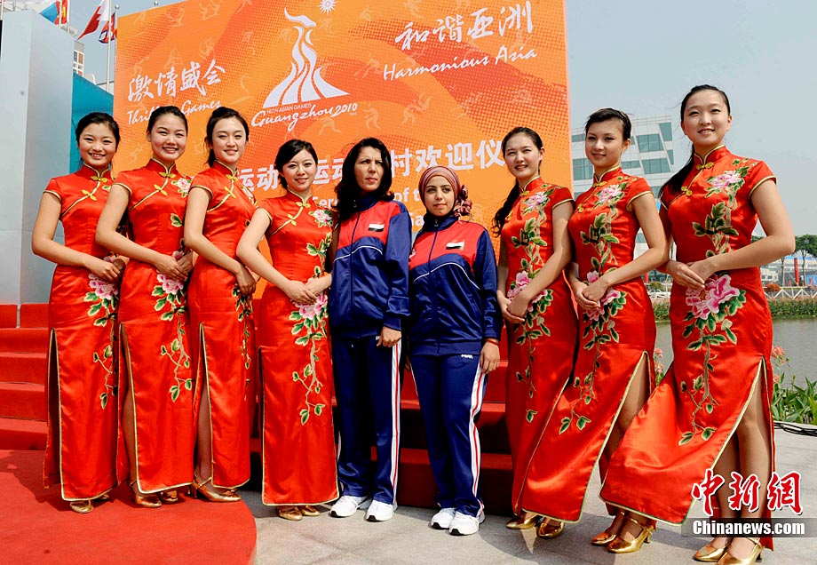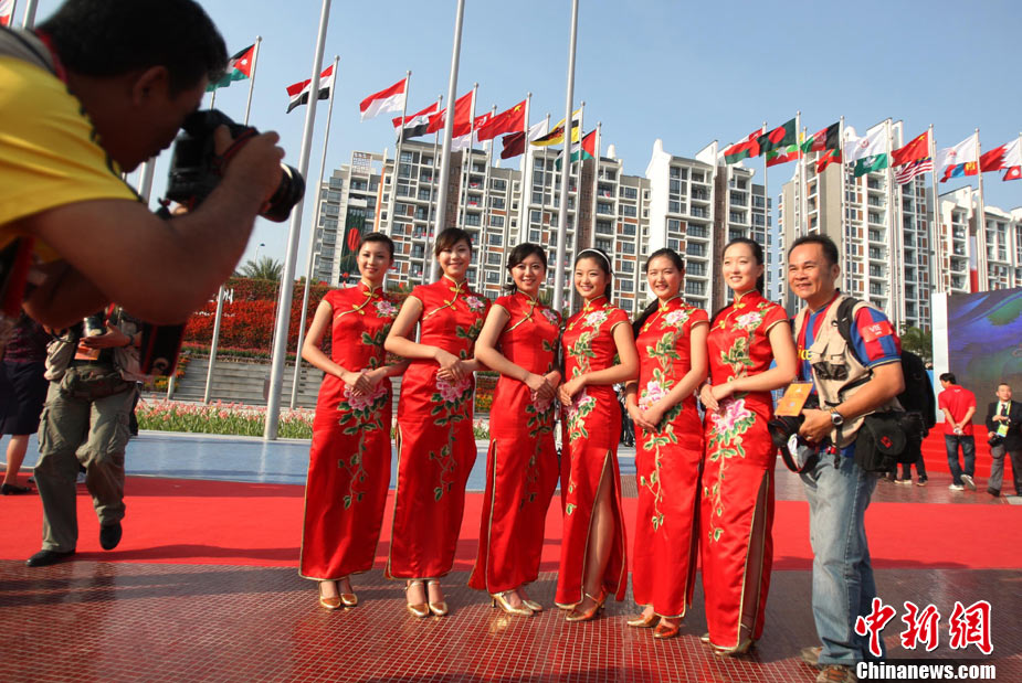 11月11日,中國(guó)禮儀小姐在廣州亞運(yùn)村給外國(guó)運(yùn)動(dòng)員展示靚麗風(fēng)采,并齊呼“一起來(lái)更精彩”。 中新社記者 陳文 攝