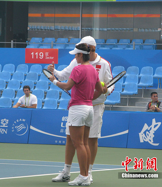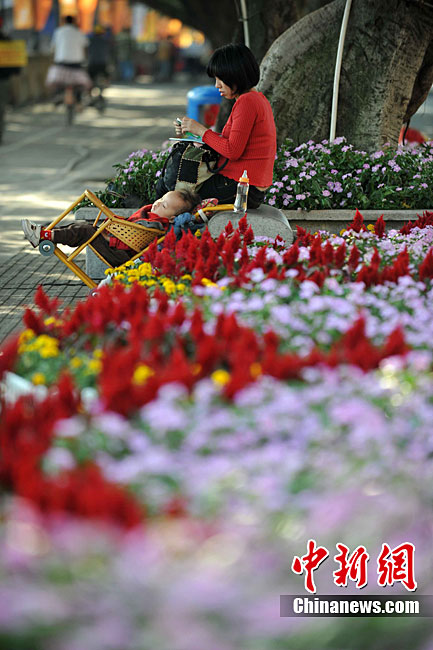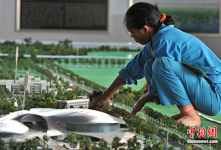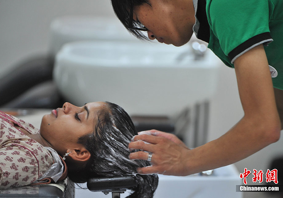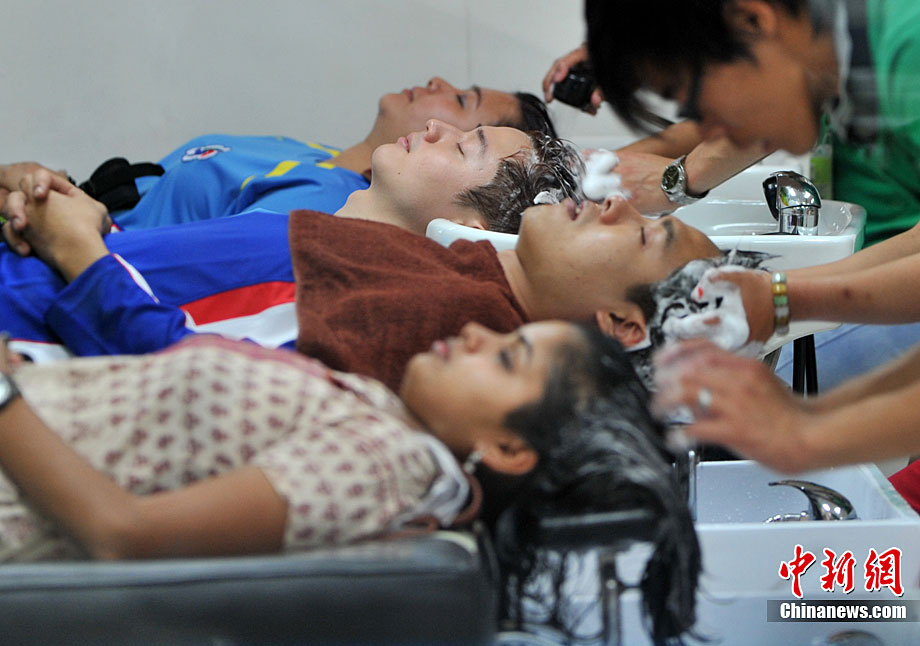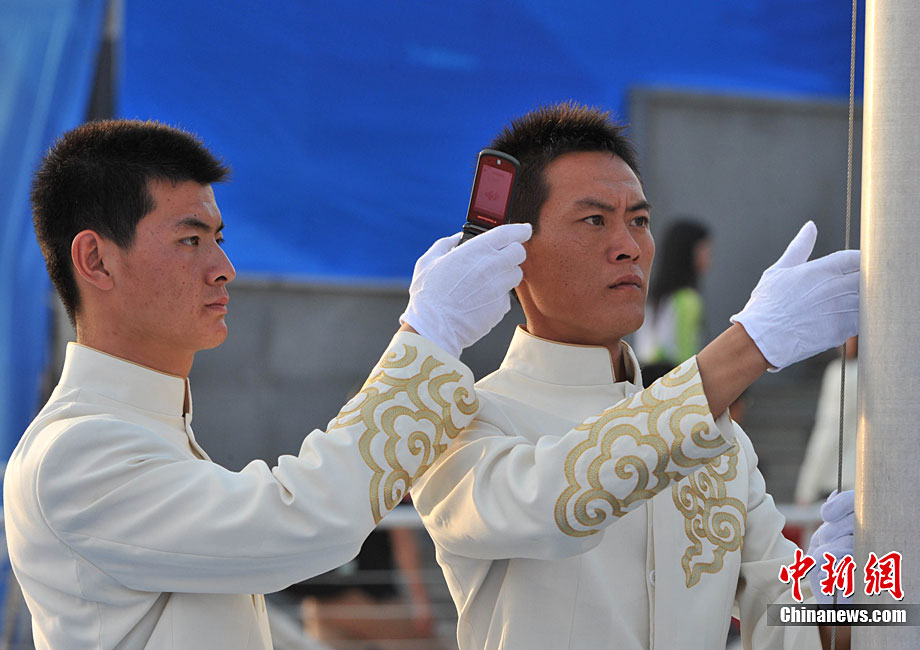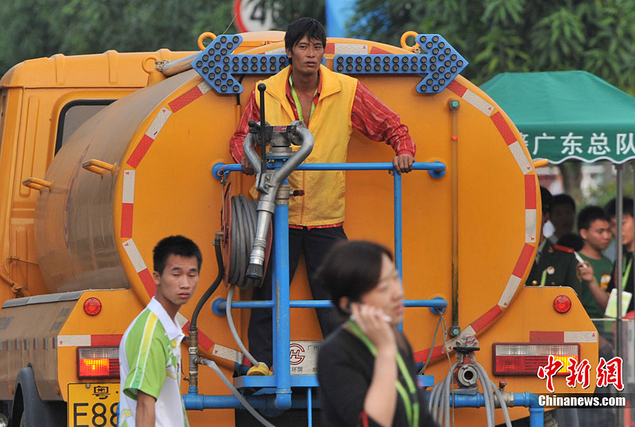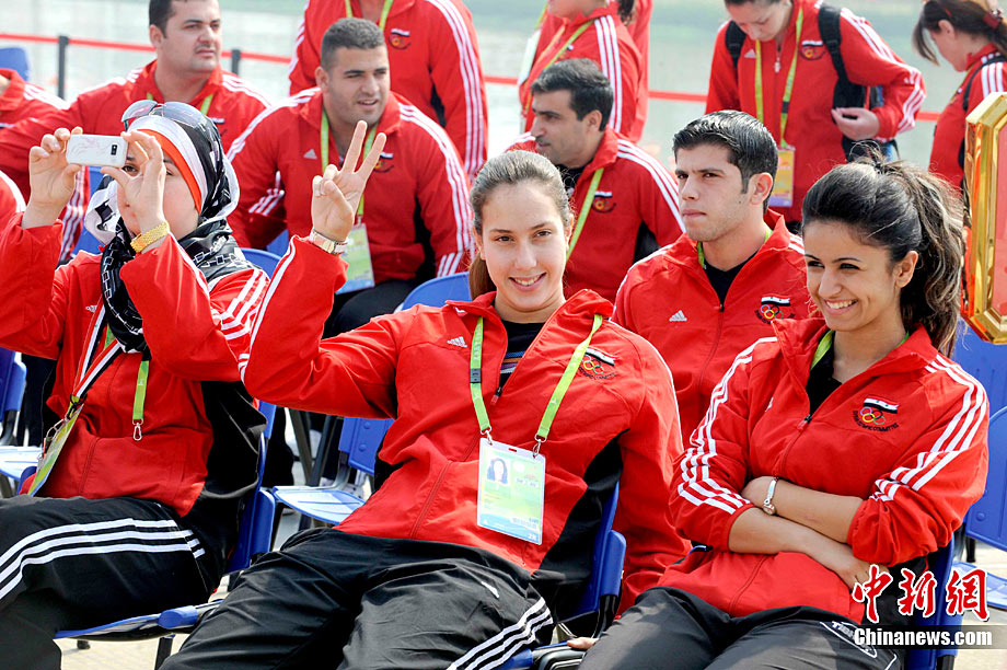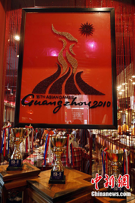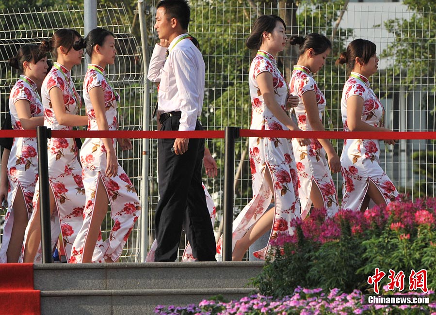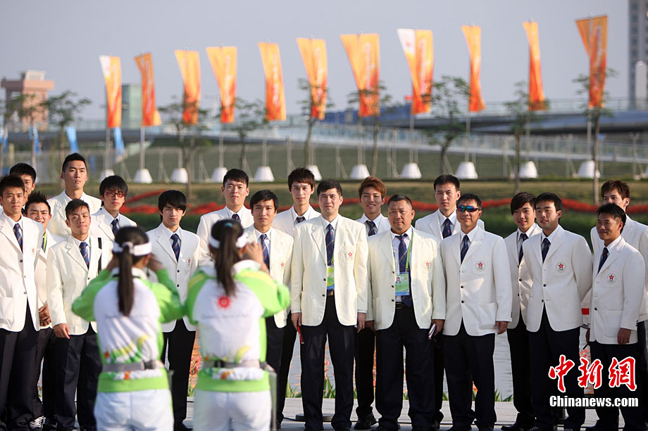 11月11日,中國(guó)禮儀小姐在廣州亞運(yùn)村給外國(guó)運(yùn)動(dòng)員展示靚麗風(fēng)采,并齊呼“一起來(lái)更精彩”。 中新社記者 陳文 攝
