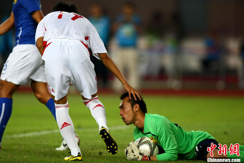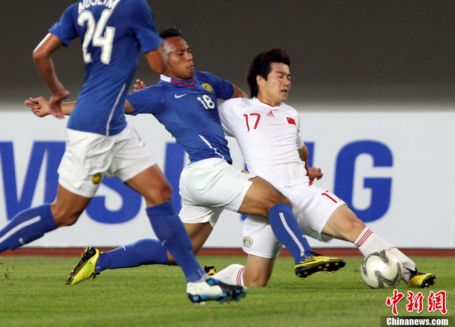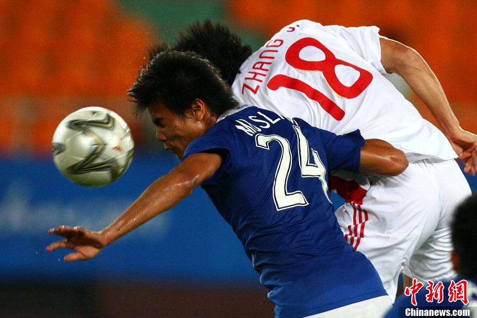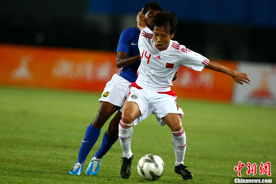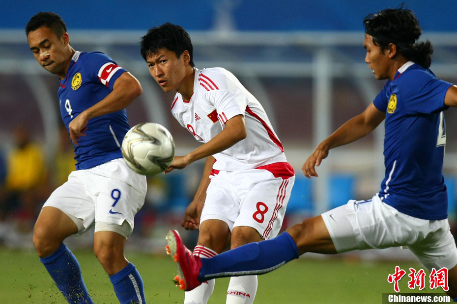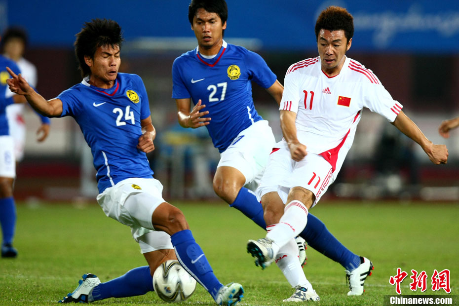 11月13日,在廣州天河體育場進(jìn)行的亞運(yùn)會男子足球小組賽A組第31場中國隊(duì)對陣馬來西亞的生死之戰(zhàn),中國隊(duì)以3比0戰(zhàn)勝馬來西亞隊(duì)小組出線。中新社記者 富田 攝