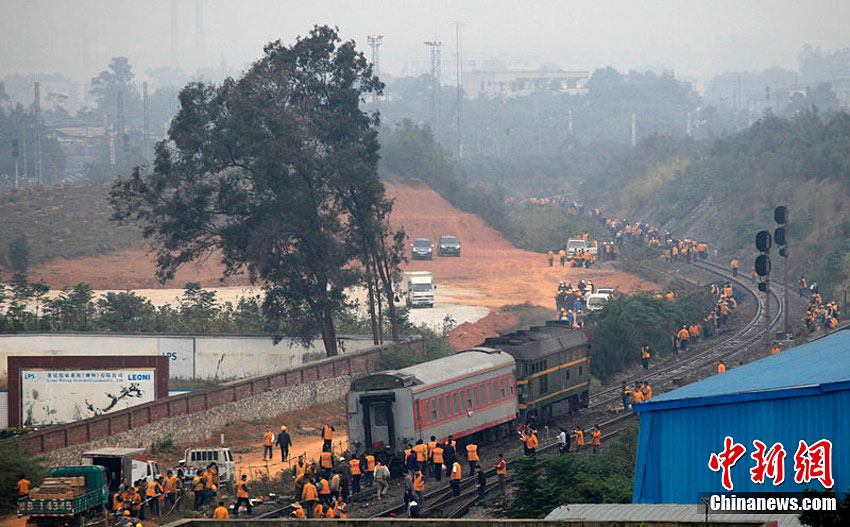 11月15日凌晨3時(shí)許,由北京開往湛江的k157次旅客列車在湘桂線柳南到達(dá)場脫軌,事故造成1節(jié)車廂脫軌,無人員傷亡,不影響行車。據(jù)介紹,脫軌車輛為機(jī)后第五位車廂,目前救援工作已經(jīng)結(jié)束,旅客已安全轉(zhuǎn)移,列車重新編組后繼續(xù)開行。事故原因正在調(diào)查中。圖為15日8時(shí)許,列車回歸正常軌道并離開事故現(xiàn)場。圖片來源:CFP視覺中國
