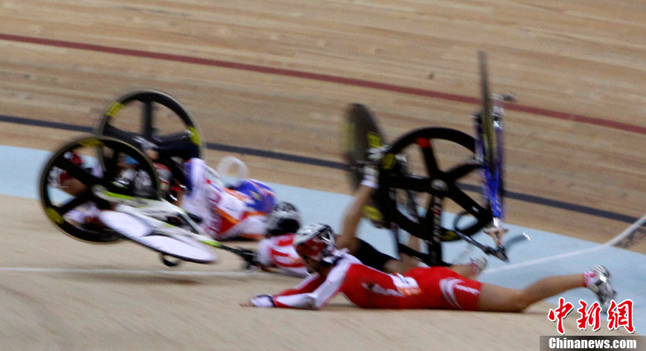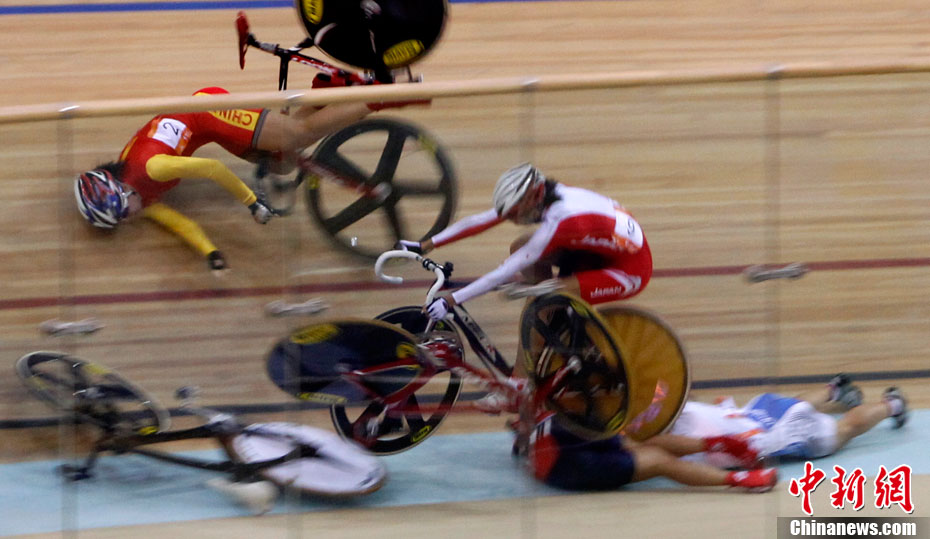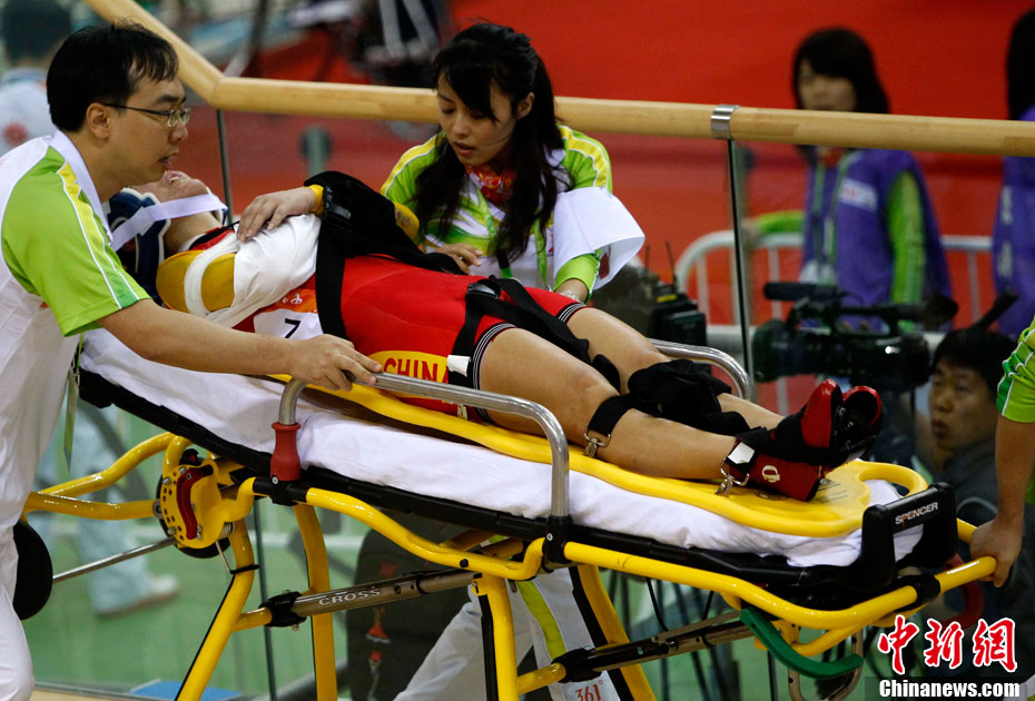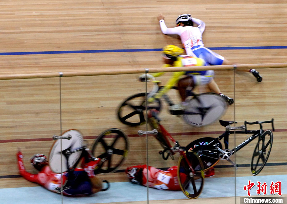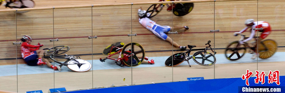 11月16日,廣州亞運(yùn)會(huì)自行車比賽進(jìn)入第四天,在女子積分賽比賽的最后沖刺階段,突發(fā)嚴(yán)重車禍,七位比賽選手均翻車倒地被送往醫(yī)院救治。其中中國(guó)的湯科蓉傷勢(shì)最為嚴(yán)重,被送往醫(yī)院急救。中新社記者 趙振清 攝