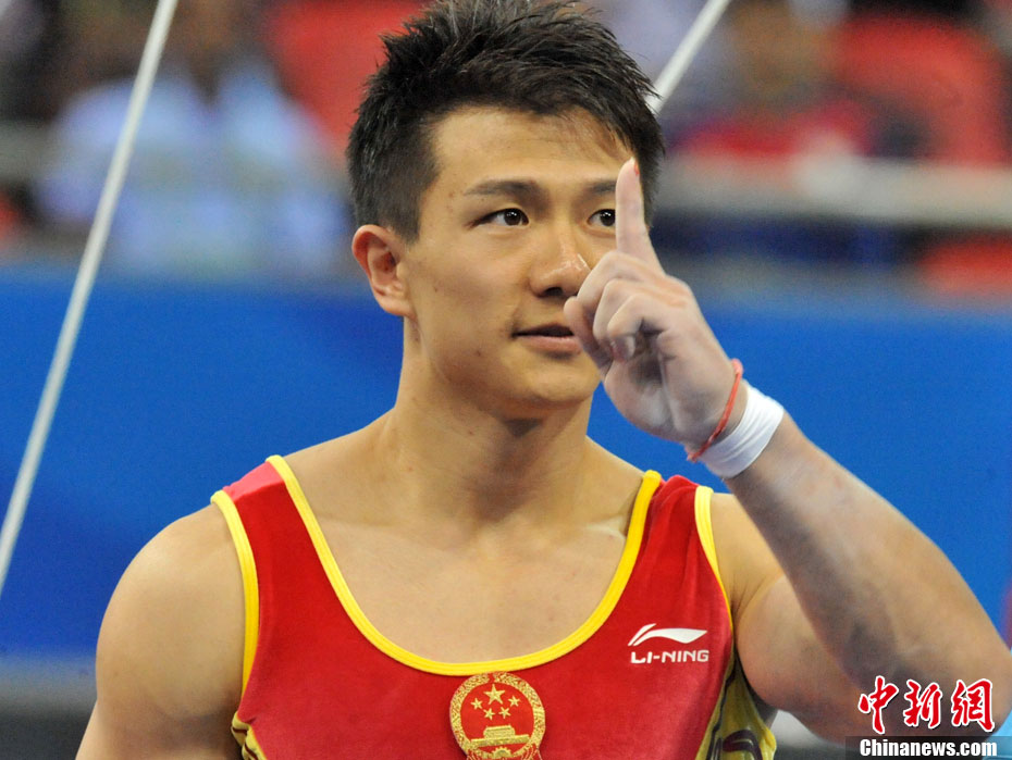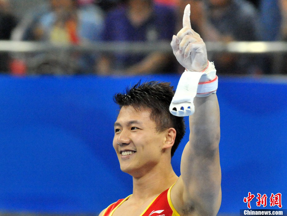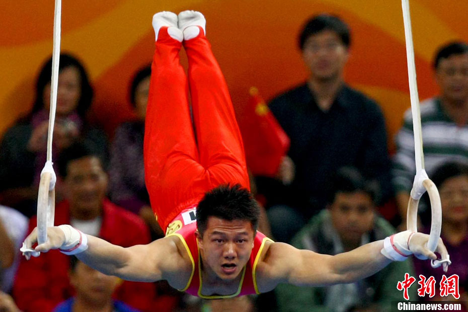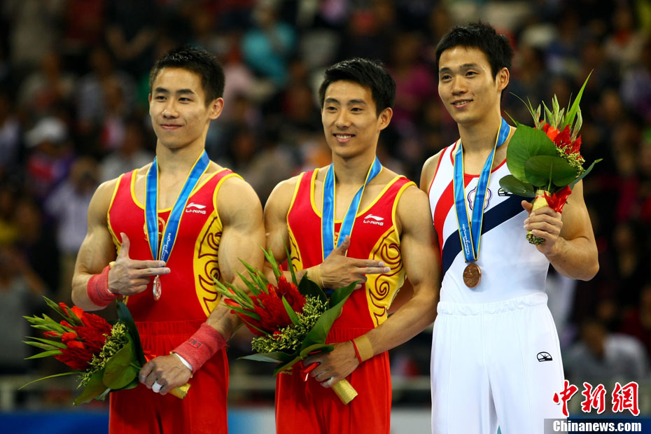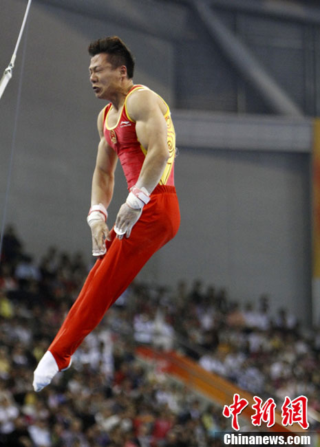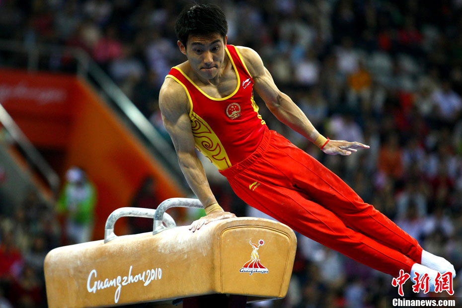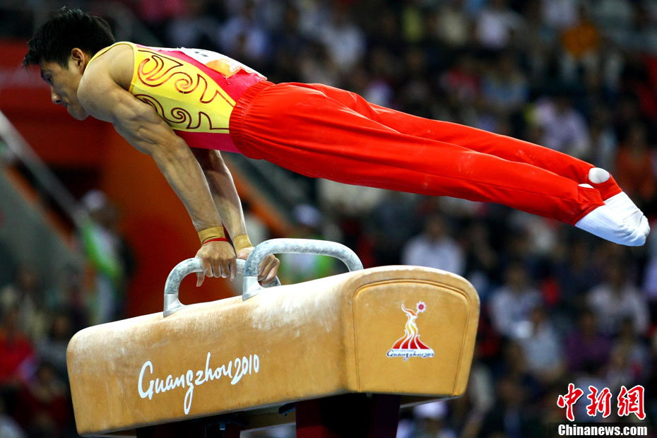 11月16日,2010年廣州亞運會體操比賽繼續(xù)在亞運城體育館進行。在男子鞍馬決賽中,雅典奧運會冠軍、中國名將滕海濱(圖)以15.375分如愿摘金;銀牌被另一位中國選手嚴明勇獲得,成績?yōu)?4.726;中華臺北選手黃哲奎以14.70分排在第三。這已是滕海濱在本屆賽事中,繼男子團體和個人全能之后收獲的第三塊金牌。中新社記者 富田 攝