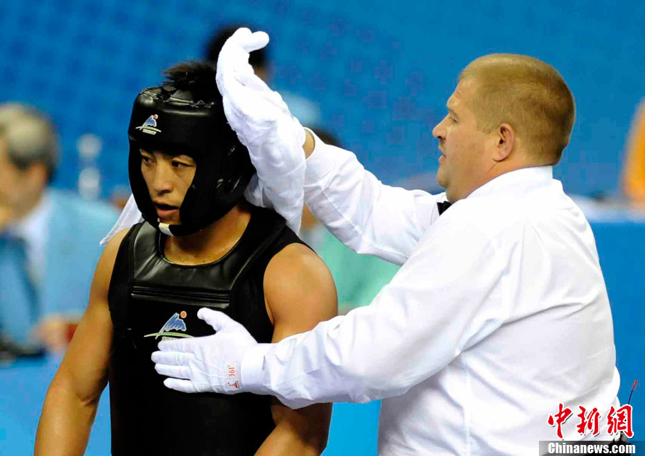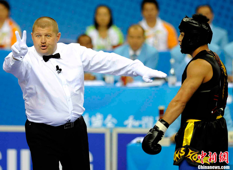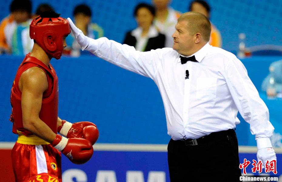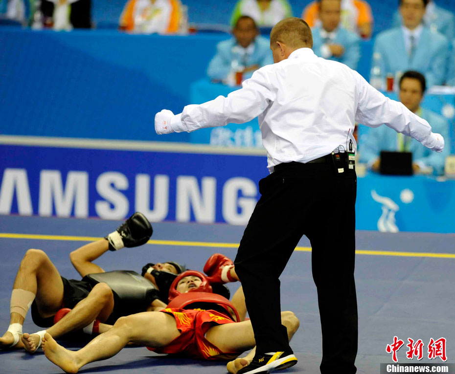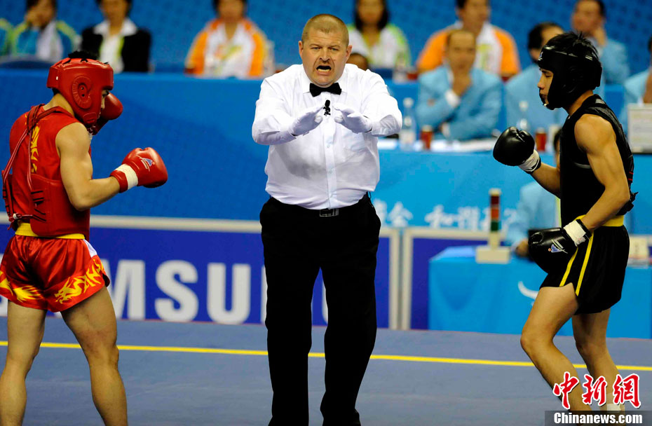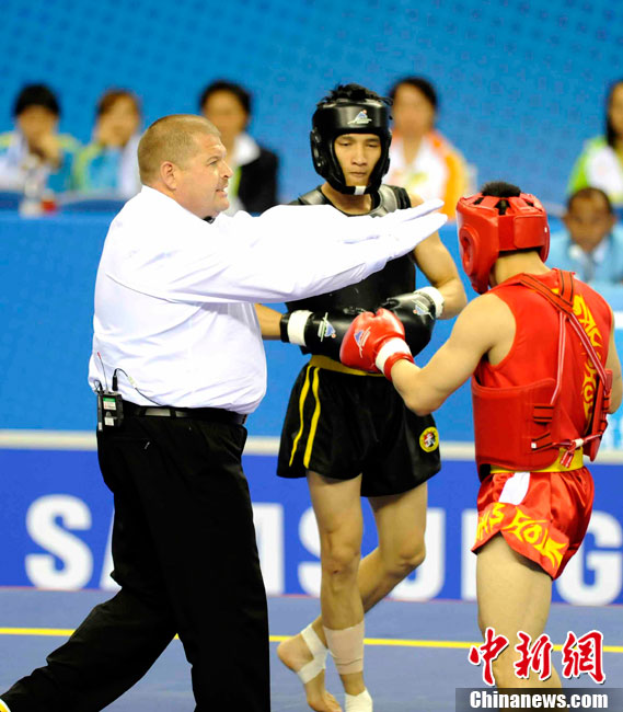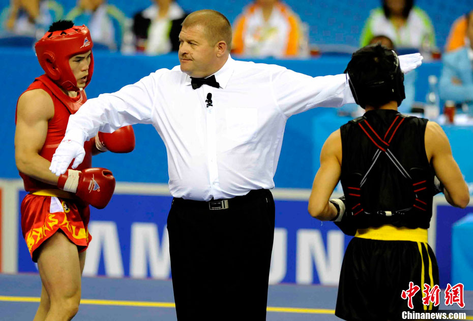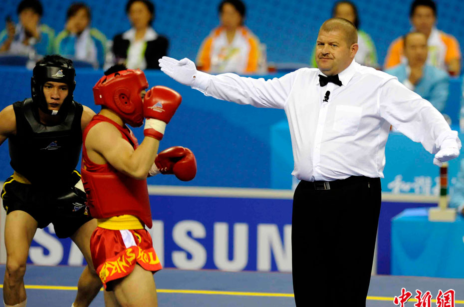 11月17日晚,亞運(yùn)會(huì)散手比賽在南沙體育館進(jìn)行,賽場(chǎng)上一位外籍裁判豐富的動(dòng)作和表情贏得滿場(chǎng)觀眾的喝彩。中新社記者 王東明 攝
