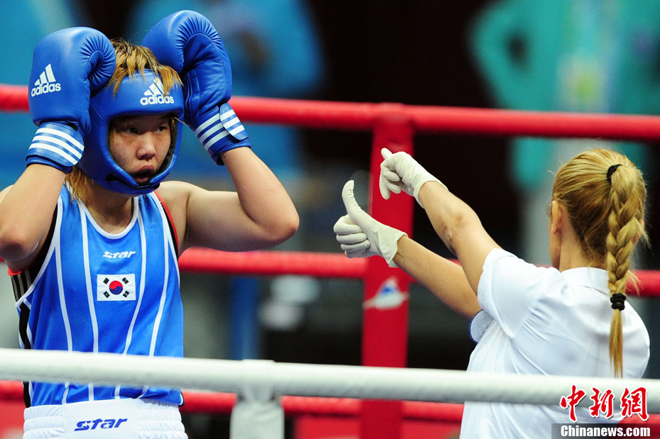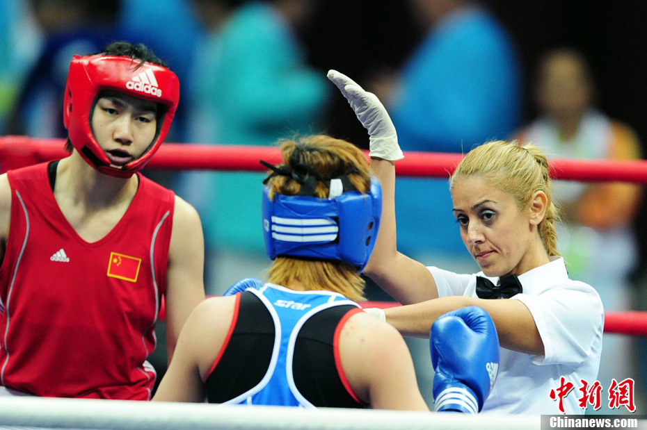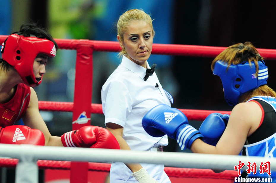 11月21日,在亞運拳擊佛山賽場,來自土耳其的美女裁判場醒目裁決、引人注目。中新社記者 陳文 攝