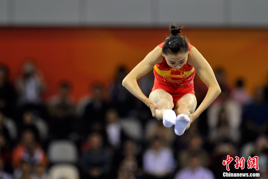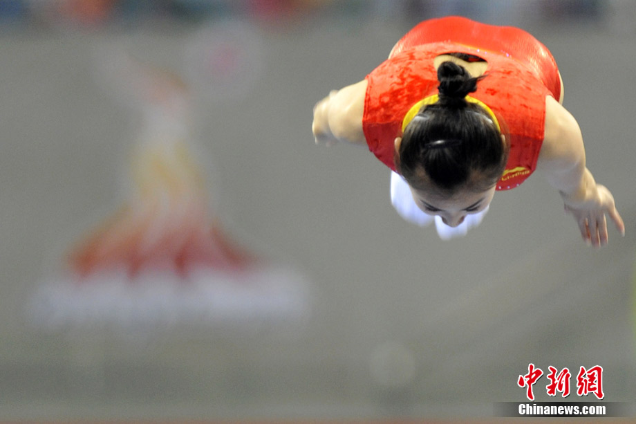 11月22日,廣州亞運會蹦床決賽在亞運城體育館舉行,“蹦床公主”何雯娜總分40.90獲得銀牌,隊友黃珊汕總分41.40摘得金牌。中新網(wǎng)記者 金碩 攝